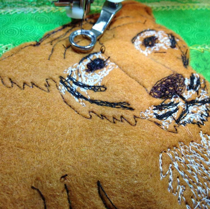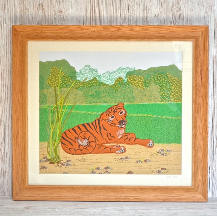 'Tiger Tiger' is the name of this textile artwork, made using raw edge appliqué techniques and embroidered with free style machine embroidery, also know as free motion or free machine embroidery. A colourful tiger rests on the ground, yet appears poised to spring if necessary.