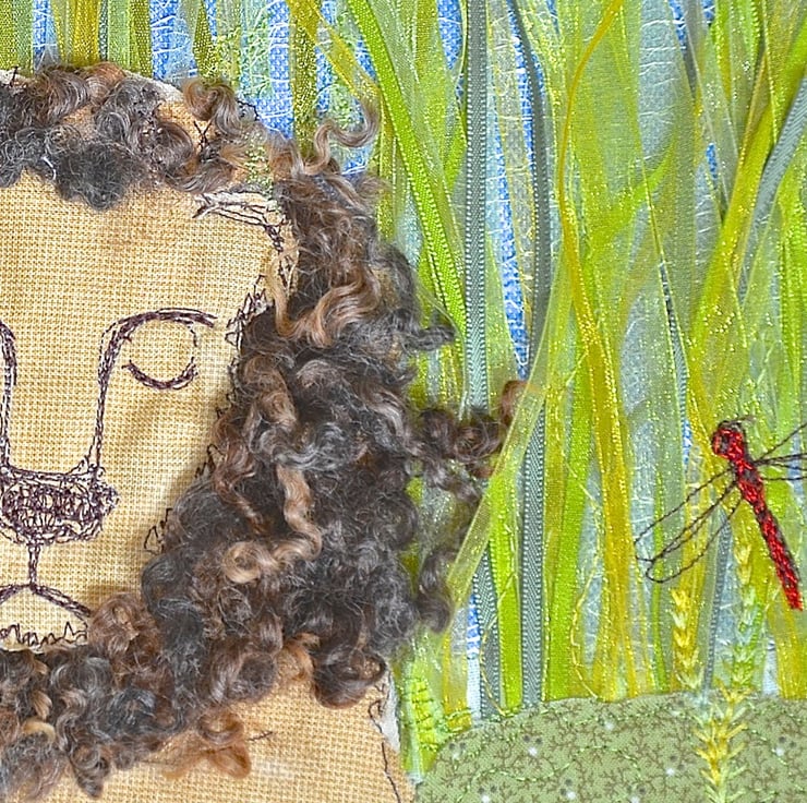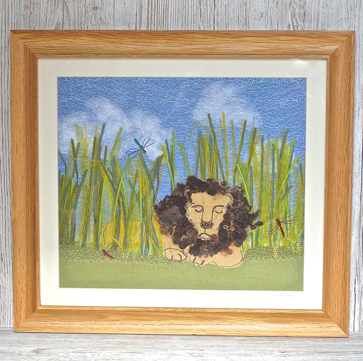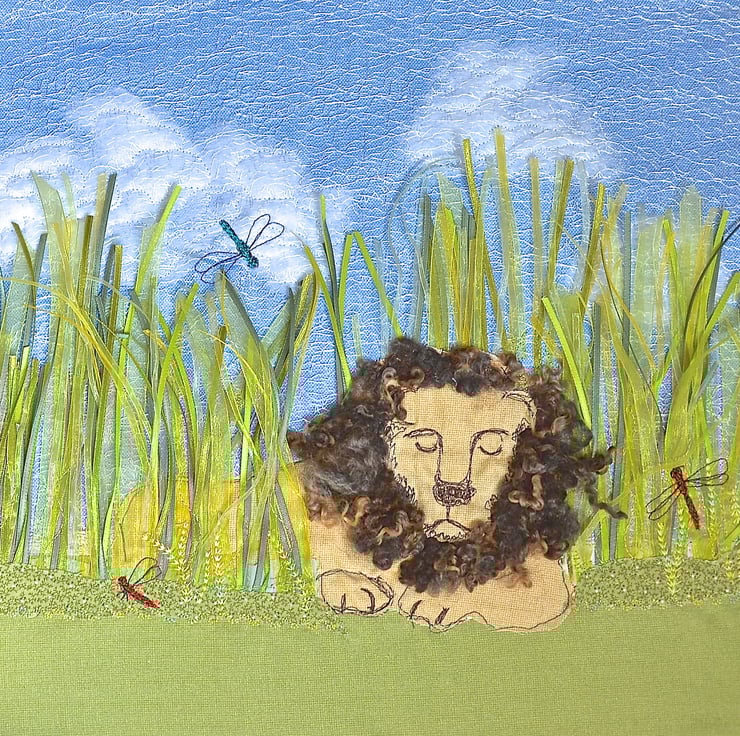 'Sleepy Lion' is a textile picture which shows a sleepy lion snoozing peacefully amongst the grasses whilst around him three dragonflies buzz happily. This textile artwork is created using raw edge appliqué techniques and embroidered with free style machine embroidery, also know as free motion or free machine embroidery. Perfect for jungle lovers or those who love the savannah or prairie.