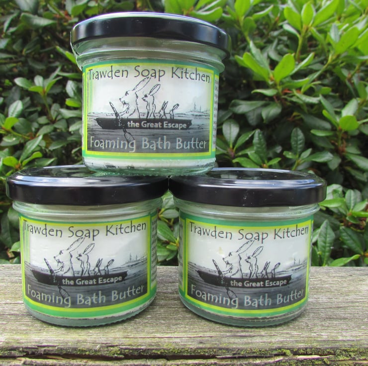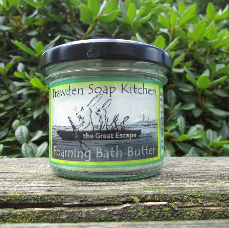 Trawden Soap Kitchen Thai Great Escape Foaming bath butter is a decadent body wash, deeply moisturising from glycerine and extra virgin olive oil. A little goes a long way. This is a 120ml glass jar, a generous 320ml jar is also available in my shop