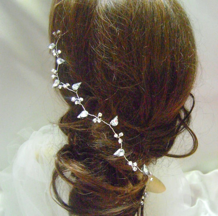 Handmade with sparkling diamantes, this is a flexible vine so it can be shaped to suit any bridal hair style, and can be fixed anywhere just by pinning it in place using the end loops, and kirby grips or pins.
