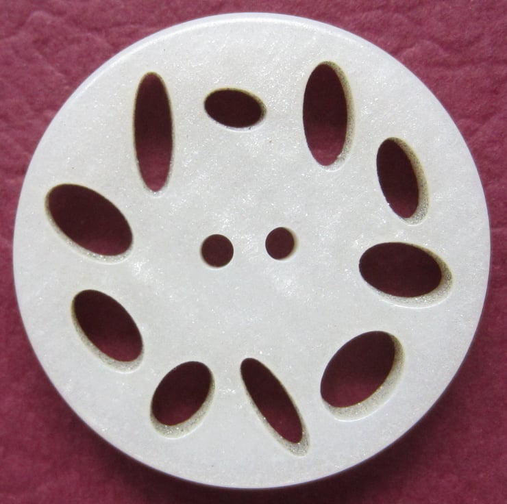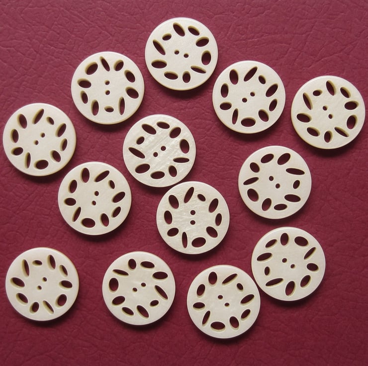 Unusual off white mother of pearl look buttons with cut out pattern. Each one measures 28 mm (just over 1 inch) in diameter.