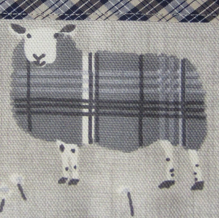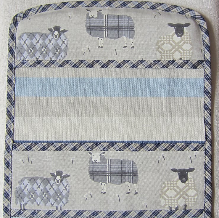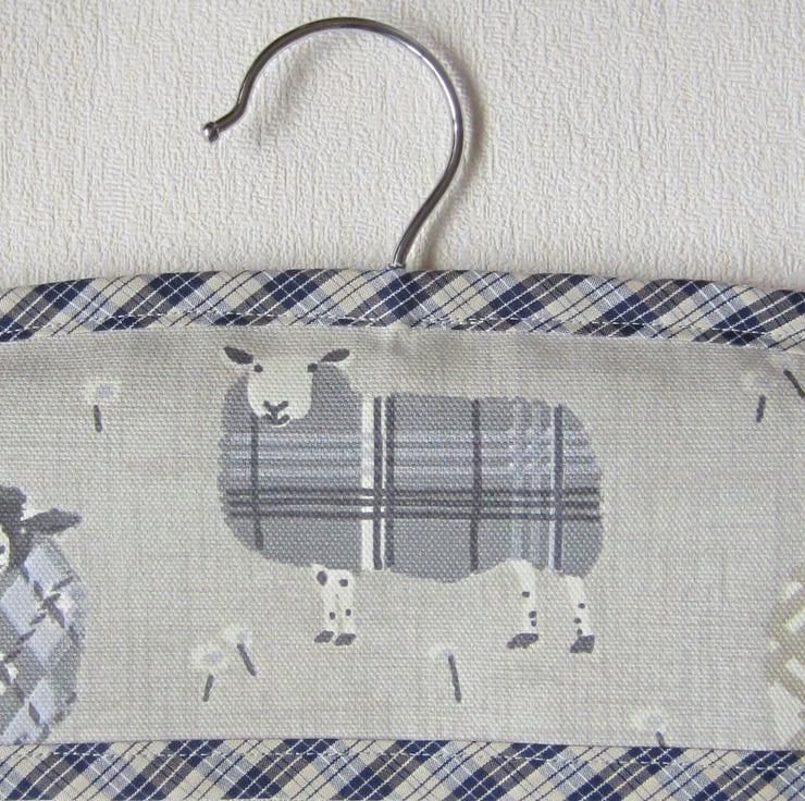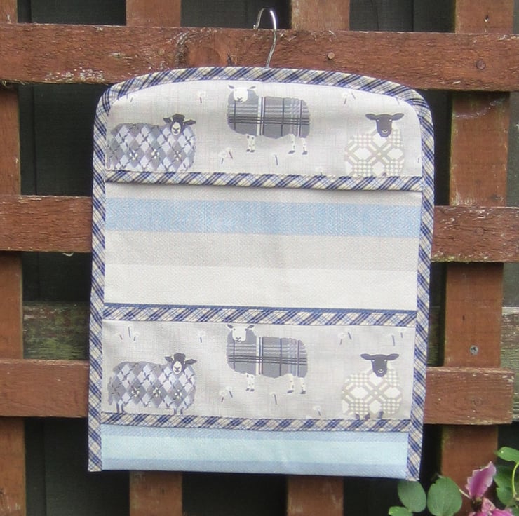 Sturdy sheep peg bag in greys and blues, edged with navy blue check bias binding. Fully lined in cream fabric. Plenty of room for lots of pegs or use for other storage such as lingerie, socks, tights etc. It measures 30 cm wide and 35.5 cm long and hangs with a strong wooden coat hanger.