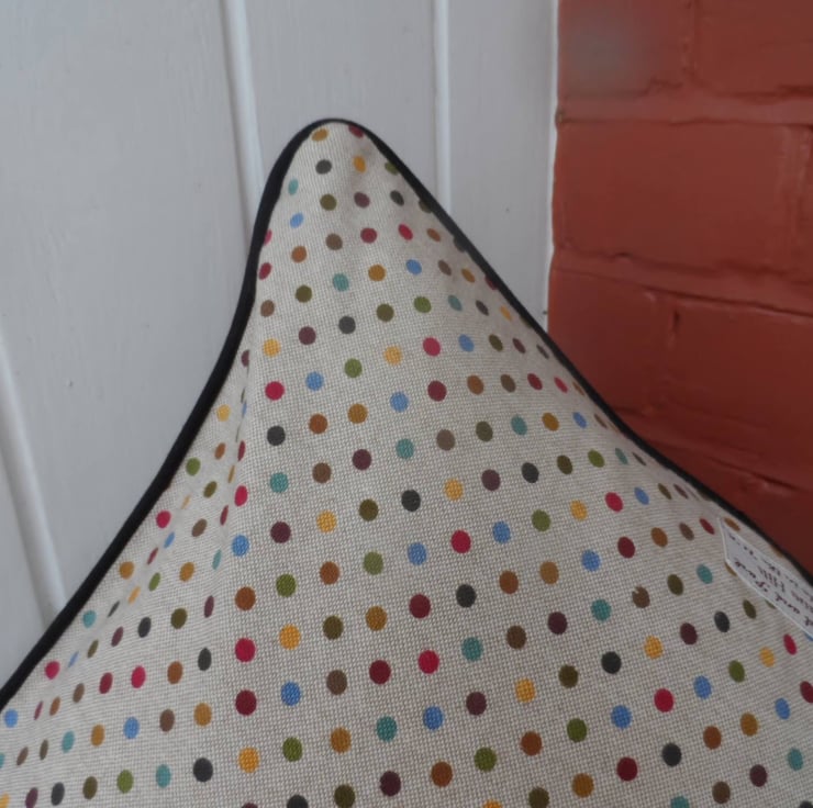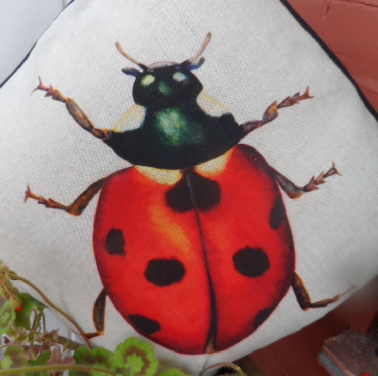 A stunning Ladybird cushion. A large Ladybird adorns the front of the cushion and a co-ordinating multi spot print is on the back. Edged with a black cotton piping and hidden zip at the back.