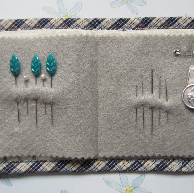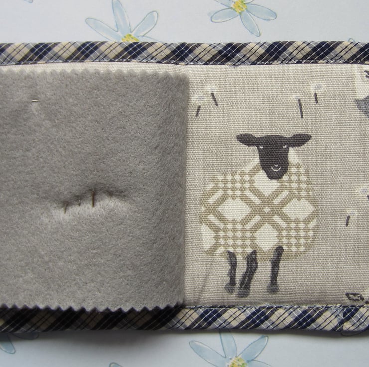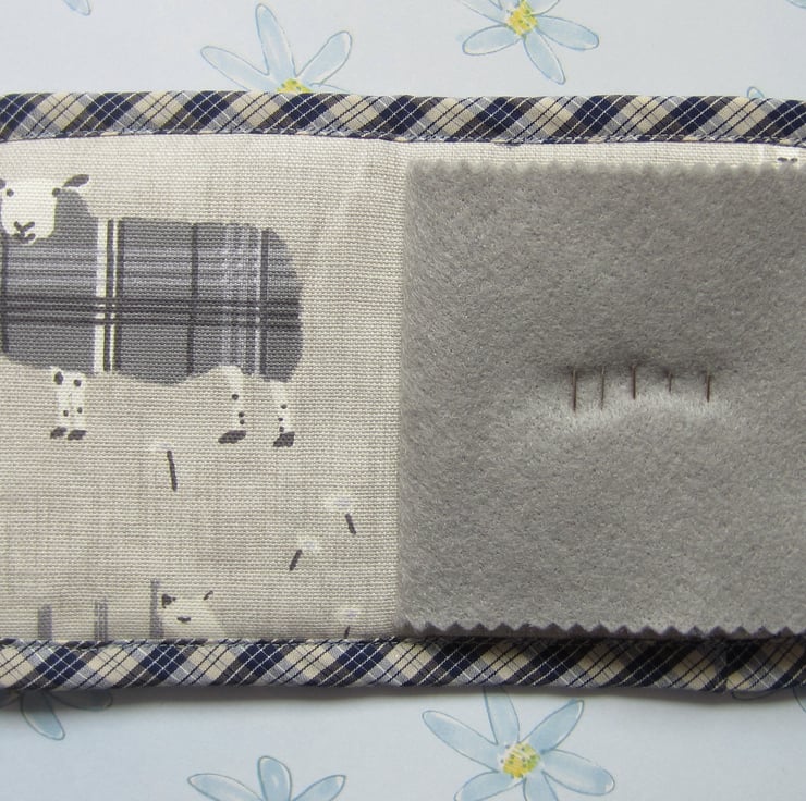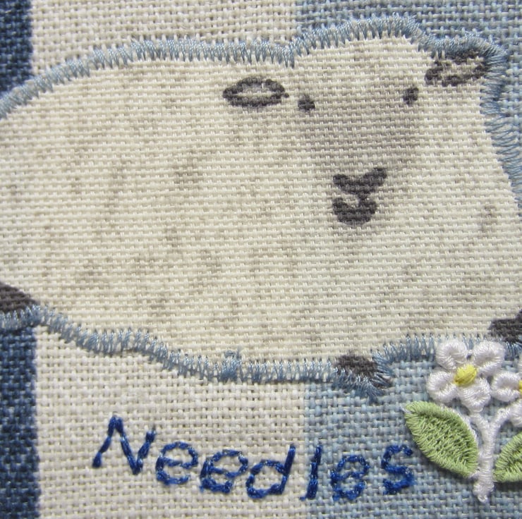 Lightly padded blue, cream and grey needle case decorated with an appliqued sheep and lace flower and leaf motif. Edged with navy blue check bias binding. Inside there is a grey felt page complete with pins, needles and a threader. Fastens with a bow at the side. It measures 13.5 x 12.5 cm when closed (13.5 x 25 cm open).