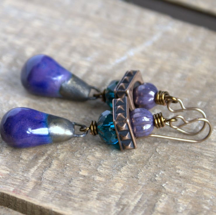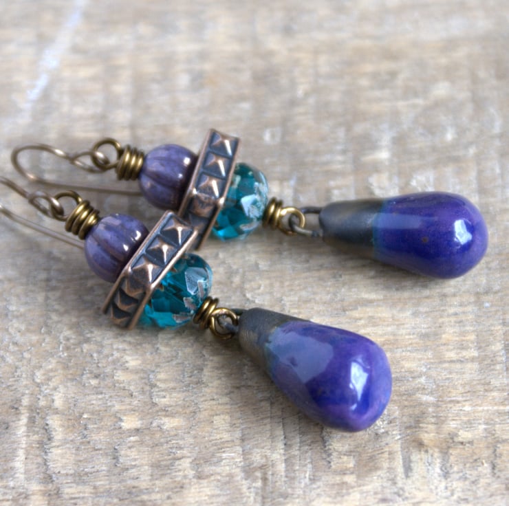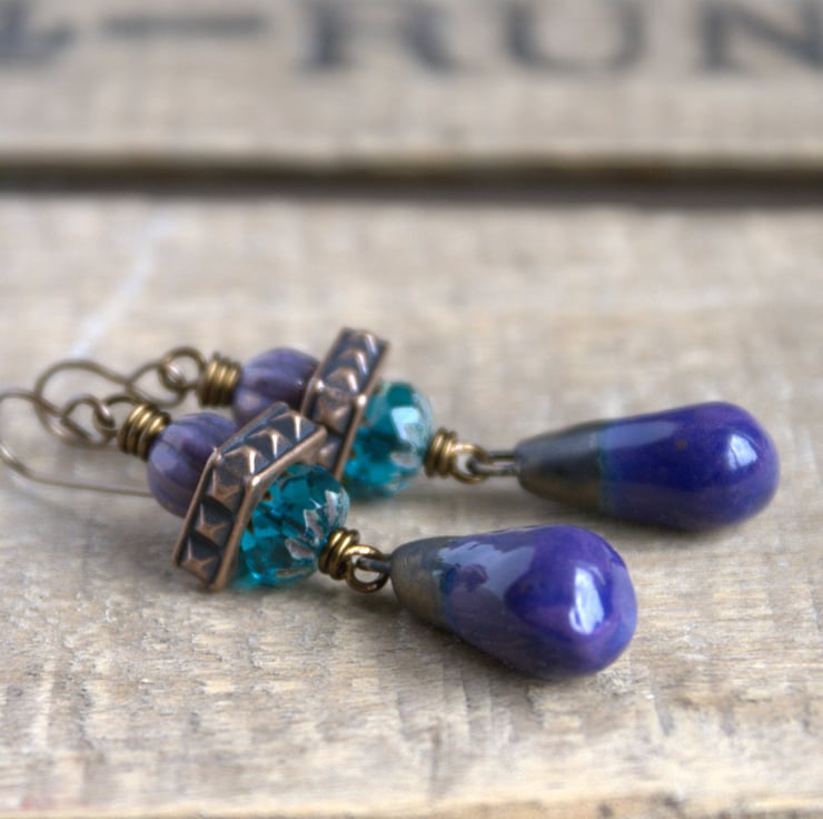 Deep Purple Drops - Long Czech Glass Earrings with Artisan Ceramic Charms