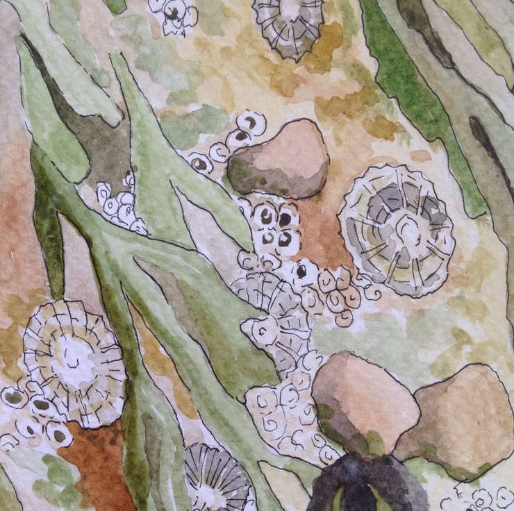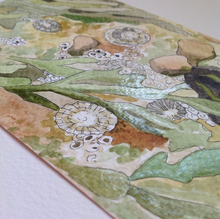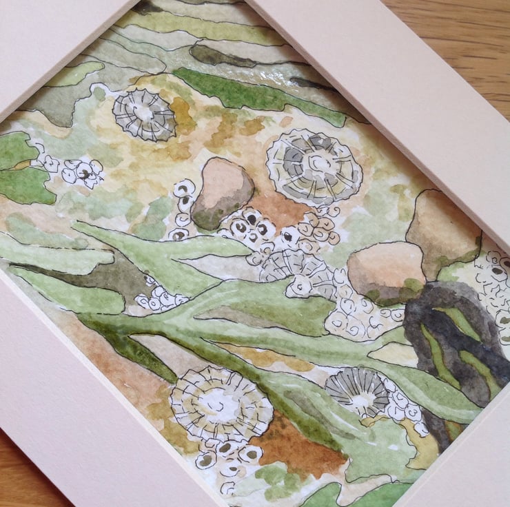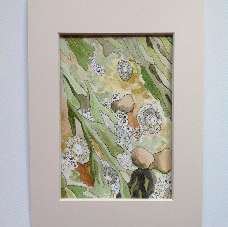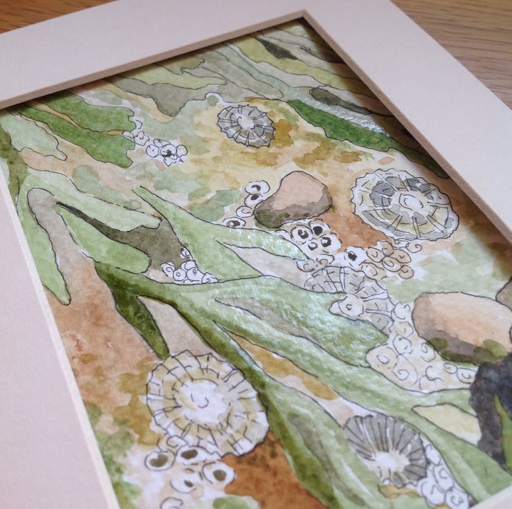 This watercolour of seaweed and shells clinging to a rock comes with a cream mount, ready to display in a frame of your choice. Alternatively, it can be used as a conventional postcard by writing on the reverse and sending it in an envelope to give as a unique piece of art. The painting is original, not a print.
