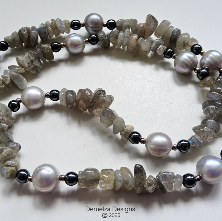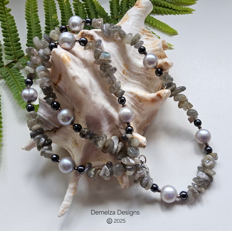 The labradorites are nicely finished tumbled small nuggets with no nasty sharp edges. Between the light grey pearls are small natural haematite gemstone round beads, complimented with a 925 sterling silver clasp and sterling silver spacer beads.