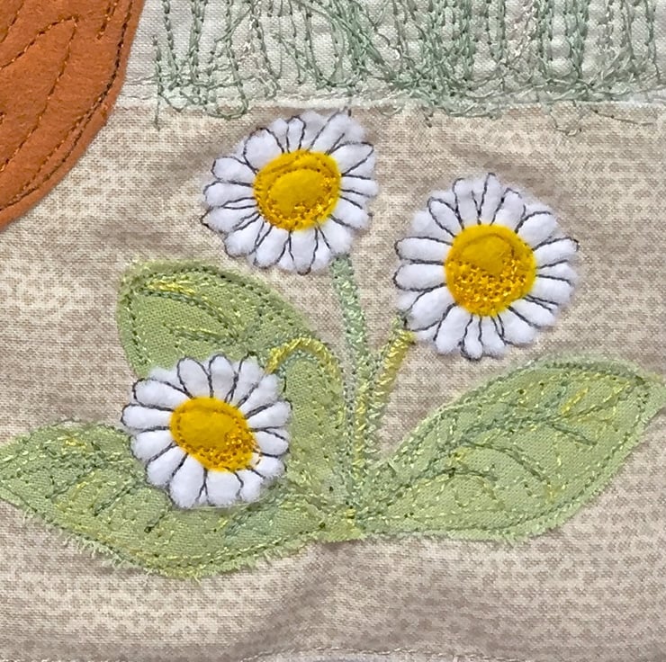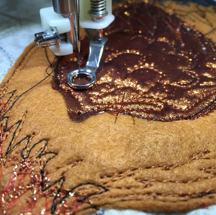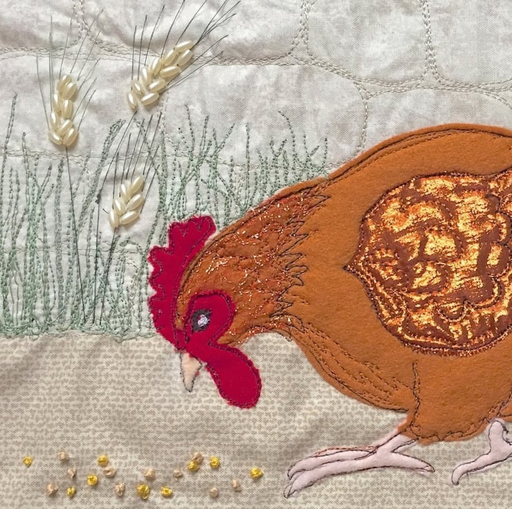 'Looking for Corn’ is loosely based on a Black-tailed Red Maran and is created using raw edge appliqué techniques and embellished with free style machine embroidery, which is where the artist uses the sewing machine needle as her pencil!