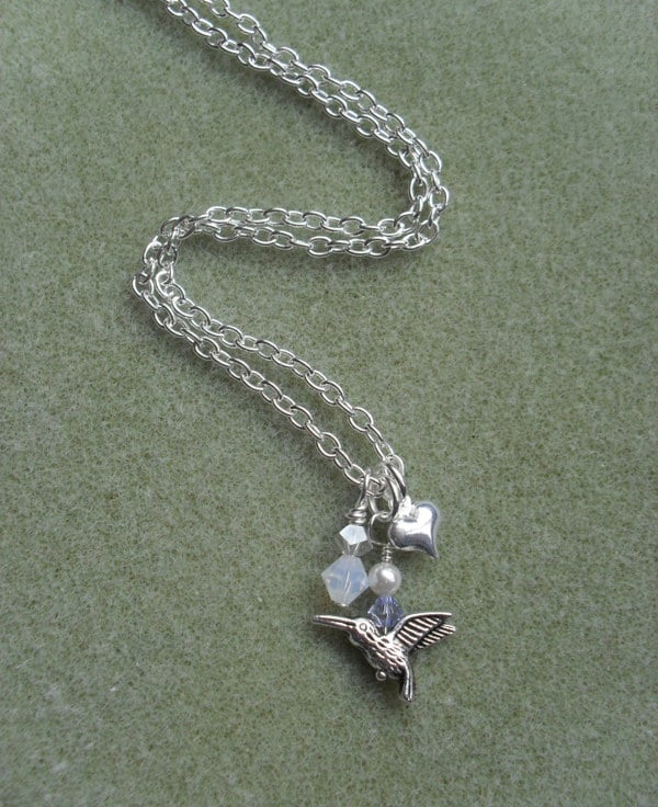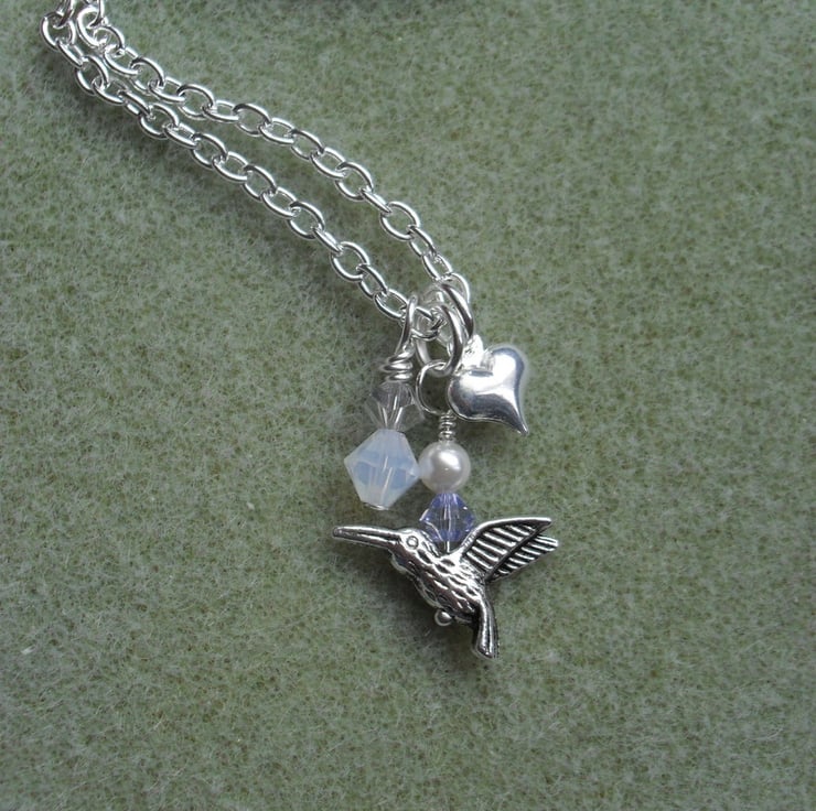 Humming bird charm with Swarovski crystals, pearl and a tiny heart charm are suspended from a 45 cm silver plated chain