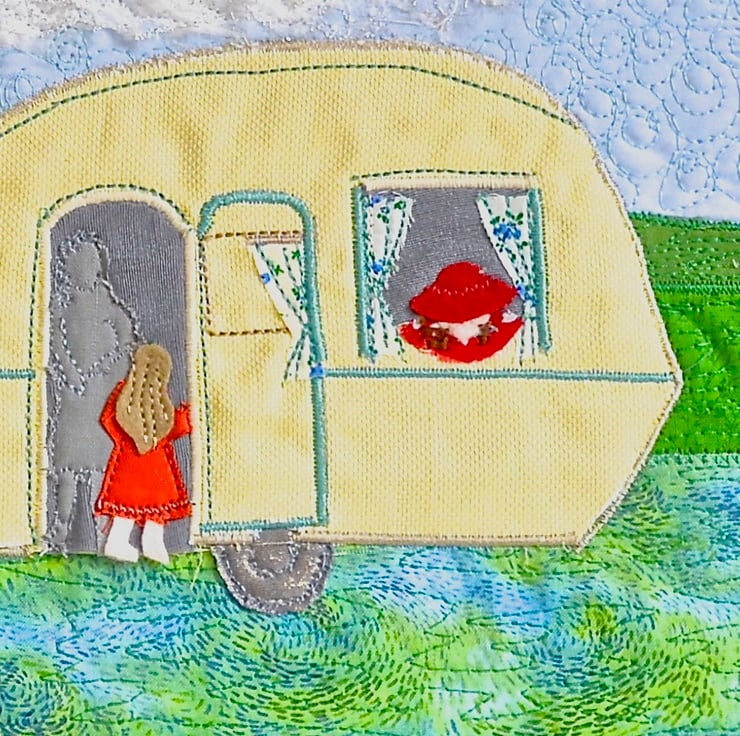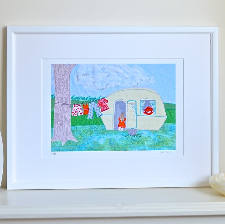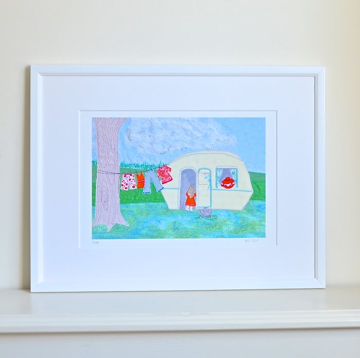 The Caravan is a lovely high quality limited edition giclee print of a lemon 1950s vintage caravan. A young child is trying to coax her siblings out to play, although they seem content to remain indoors - maybe lunch is being prepared?! Outside the washing hangs on the line and a wise old owl surveys the scene from above.