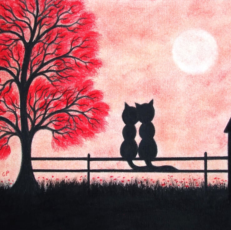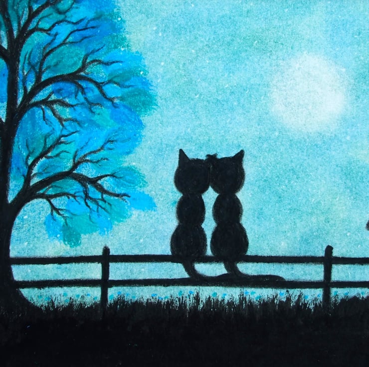 Cat Card, Romantic Moon Card, Two Black Cats, Love Art, Engagement, Anniversary