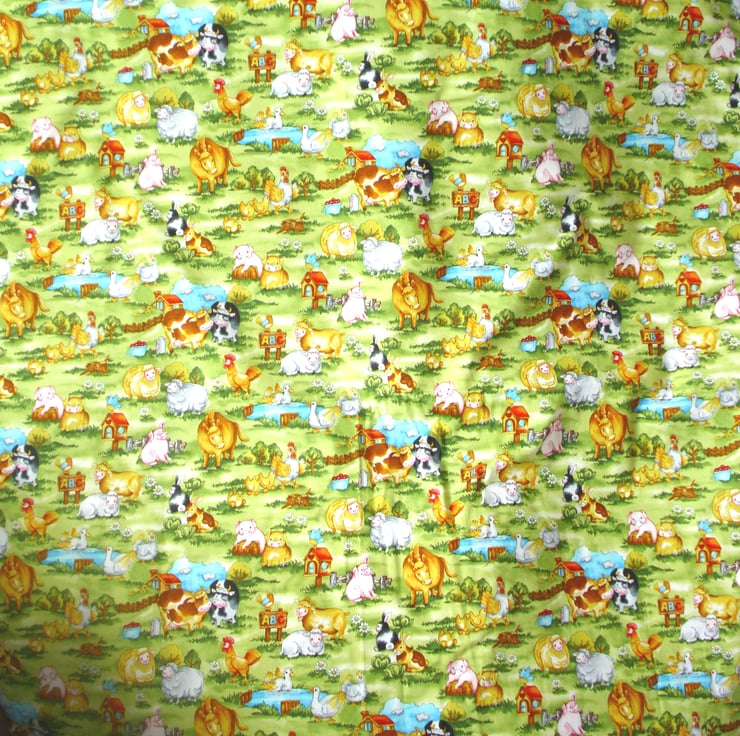 On A B C Farm cot quilt with Ducks, bunnies, cows and pigs, horses and sheep, ducks on the duck pond, hens and chicks and goats, with milk churns, buckets of rosy red apples, bird houses with pretty blue birds singing, lots of green trees and pretty daisies. a very bright colourful quilt . fully washable and tumble dryable 100cm x 96 cm approx .