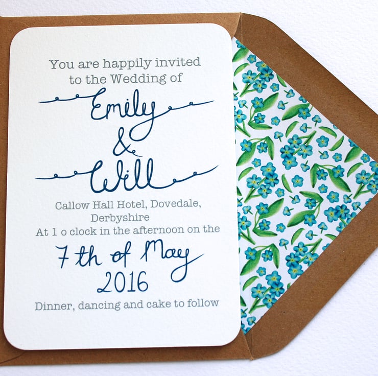 Pretty personalised forget me not wedding invitation, featuring my original watercolour forget me not pattern with personalised hand lettering.