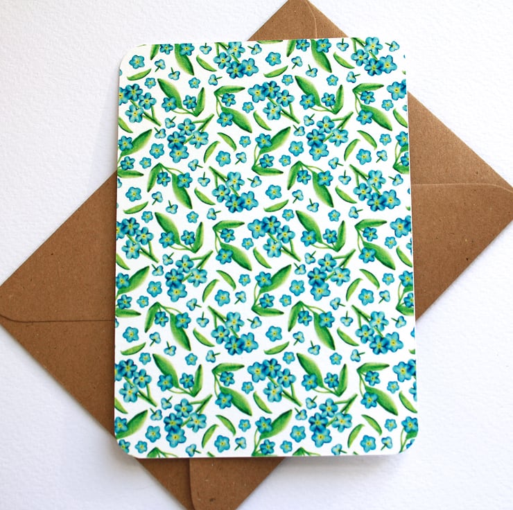 A6 size approximately 148x105mm, printed to the front with hand lettering and type details and printed to the back with my watercolour forget me not pattern, finished with cute rounded corners, with a matching recycled kraft envelope and matching forget me not pattern envelope liner.