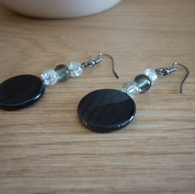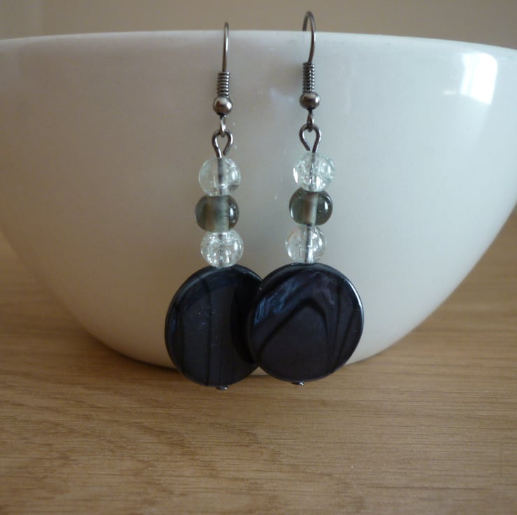 THE EARRINGS HAVE BEEN MADE USING ROUND CHARCOAL GREY MOTHER OF PEARL ROUND DISC SHAPED BEADS ALONG WITH SMALL ROUND GLASS BEADS IN DARK GREY AND CRYSTAL AND FINISHED WITH DARK GREY COLOURED EAR WIRES.
