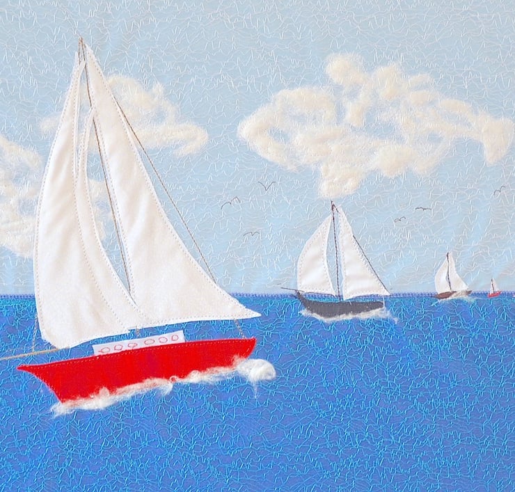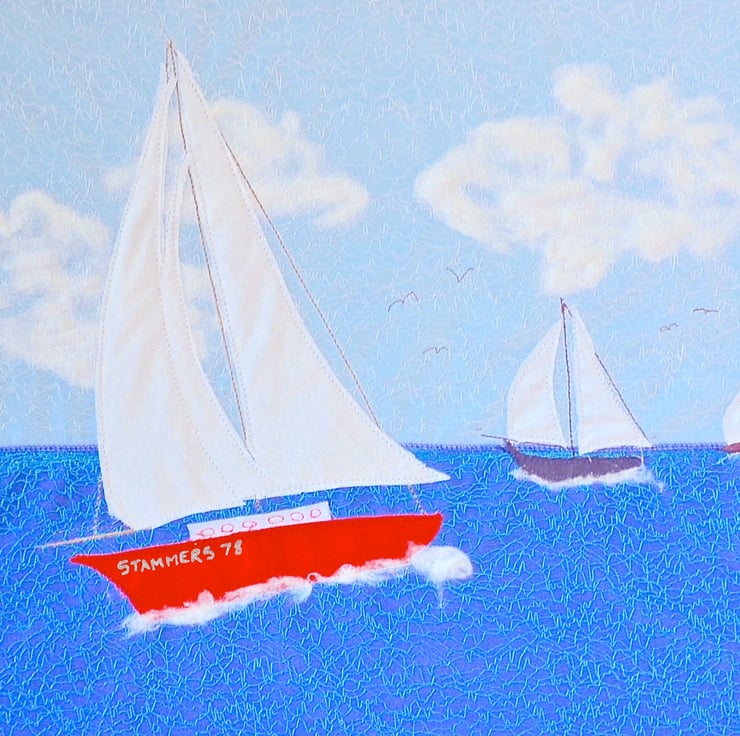 The race is on! is a lovely high quality giclee print of a red sailing boat racing along the azure seas, with four other sailing boats trailing behind.