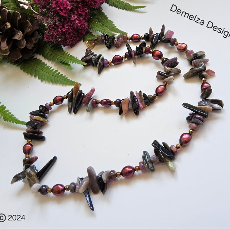 This necklace has been hand crafted in Cornwall using long multicoloured toothed cut tourmalines, deep luxurious plum coloured fresh water baroque pearls and faceted bronze colour coated haematite . It has an organic look which would be ideal for every day wear for working professional ladies or for those who enjoy wearing casual genuine gemstone designer jewellery on a daily basis. It would however also look lovely for formal evening wear. The bronze coloured faced haematites add a suttle sparkle to the necklace as the light hits it.