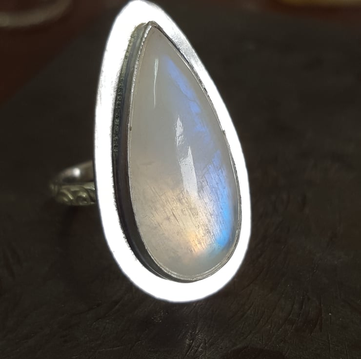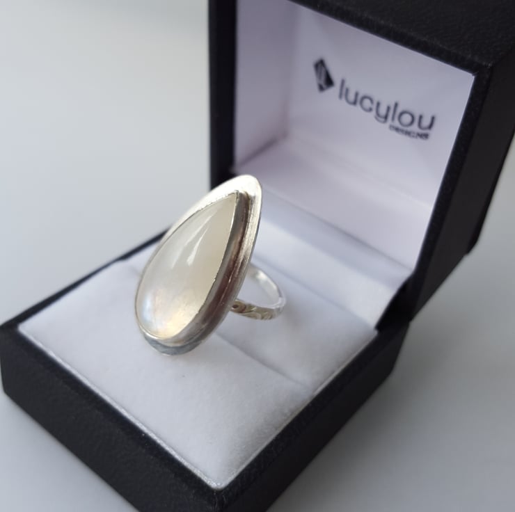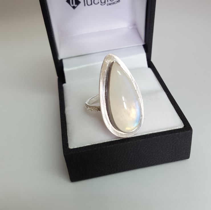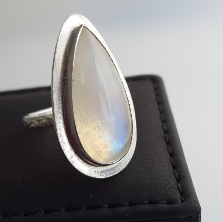 This beautiful pear shaped moonstone captures the light and displays spectacular blue flashes on its fine milky white surface, making this ring something truly special.