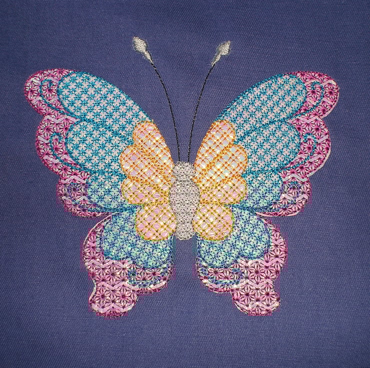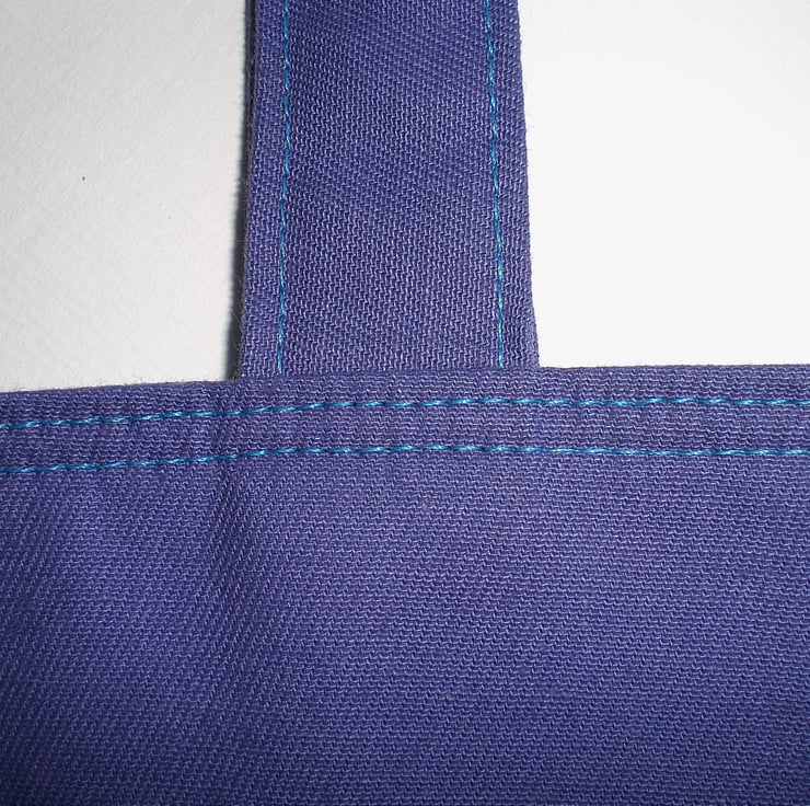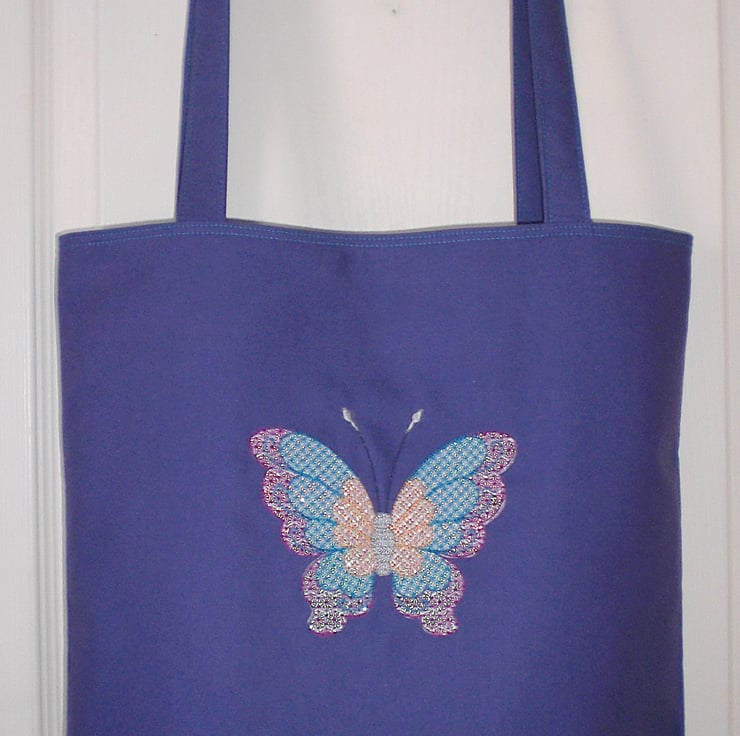 A medium sized tote bag made of purple cotton drill fabric, embroidered with a lovely butterfly. There is contrast top stitching along the top edge of the bag and on the handles in a vibrant deep turquoise blue.