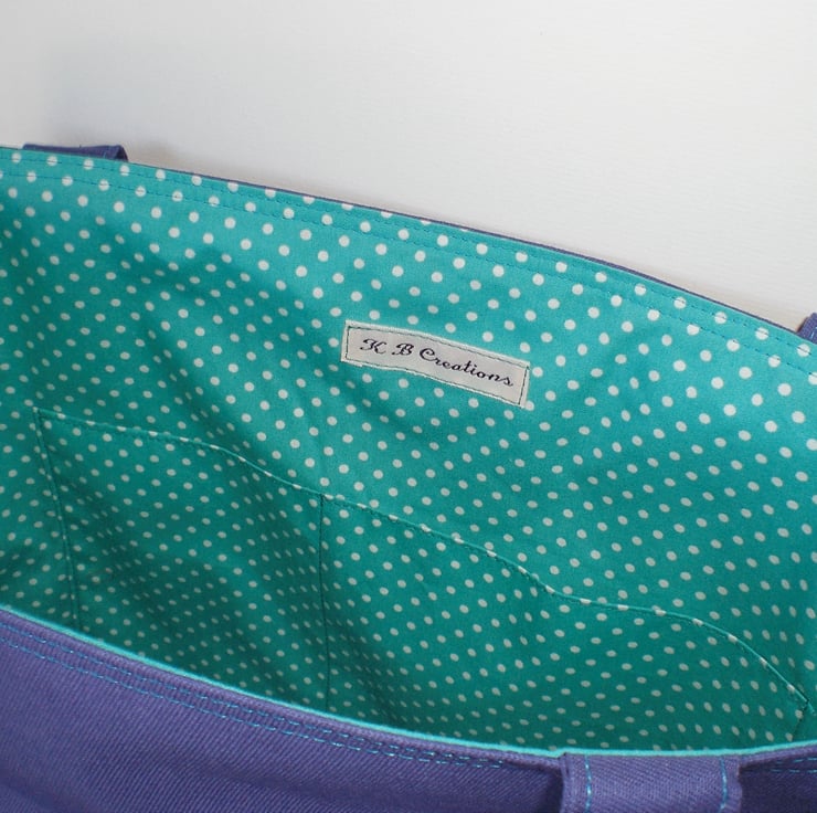 The inside is lined with a lovely cotton spotty fabric in turquoise and white, with 2 slip pockets.