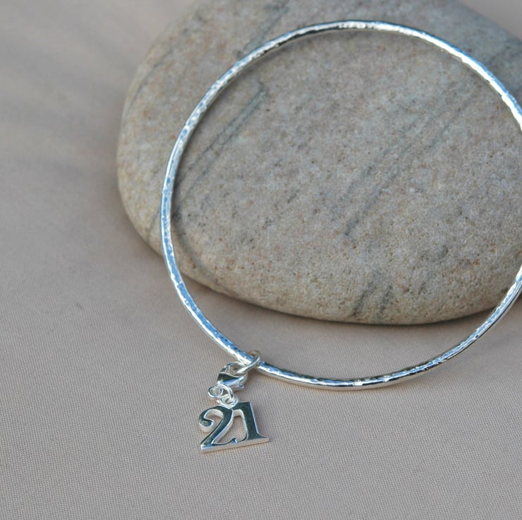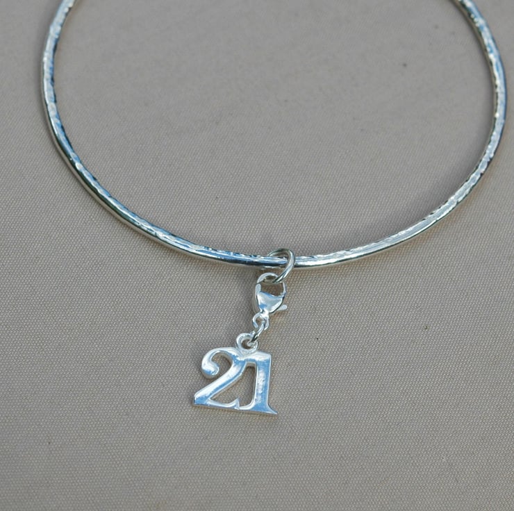 The perfect gift for a friend or relative's 21st - this gorgeous bangle is made from sterling silver round wire 2mm in diameter, which has been beaten from above and below with a ball-pein hammer and then tumble-polished to a bright shine. The result is a dimpled texture which sparkles as it catches the light. The bangle has been hallmarked by the London Assay Office and I have added a sterling silver '21' charm which is stamped '925'. The charm is about 12mm wide and is attached to a jump ring by means of a lobster clasp - so it can easily be removed and transferred to another bracelet or chain.