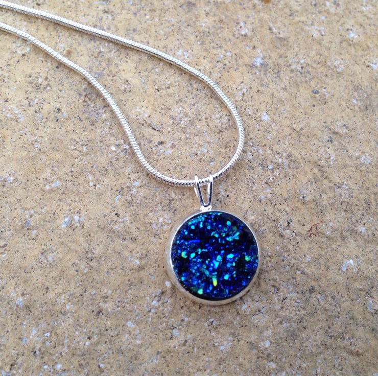 This stunning necklace of a peacock blue sparkly faux drusy druzy cabochon which is approx 12mm and sits in a bright silver tone cabochon setting.