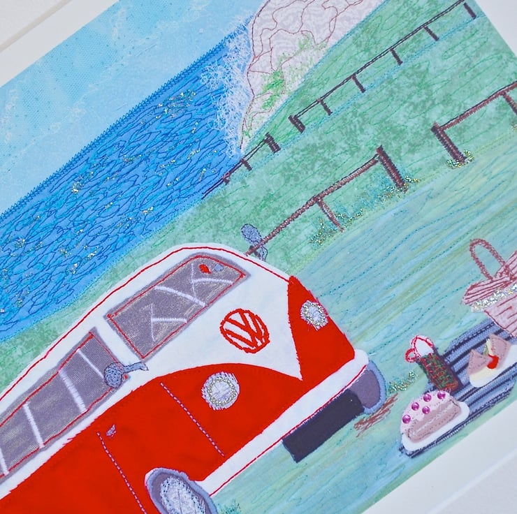Red Campervan is a print of an iconic red camper van, parked on the cliff's edge, with gorgeous blue seas and lighthouse behind. A picnic is spread out, ready for the lucky family or couple.
