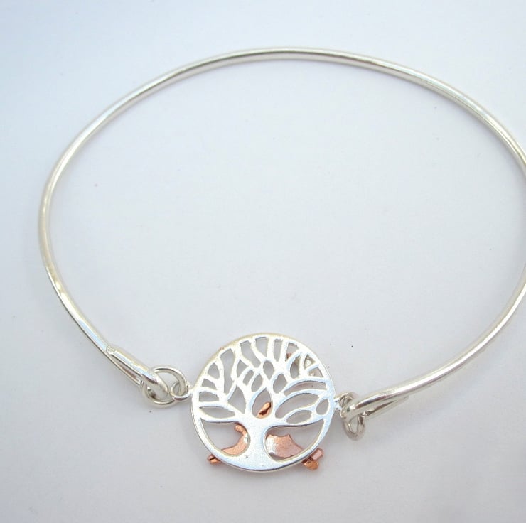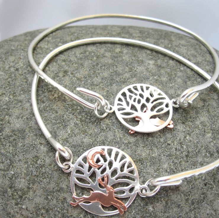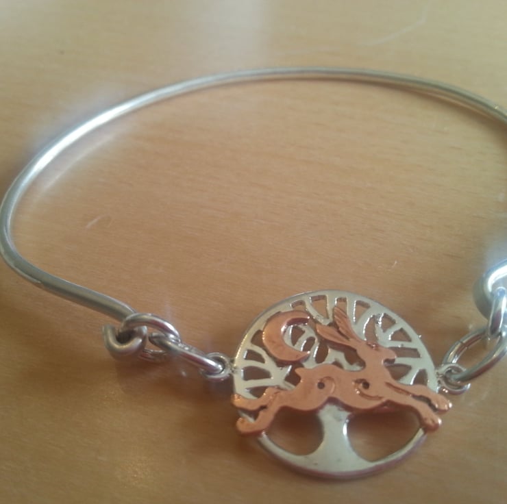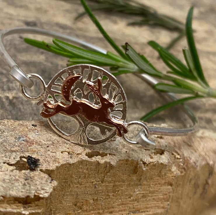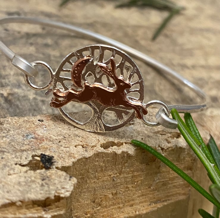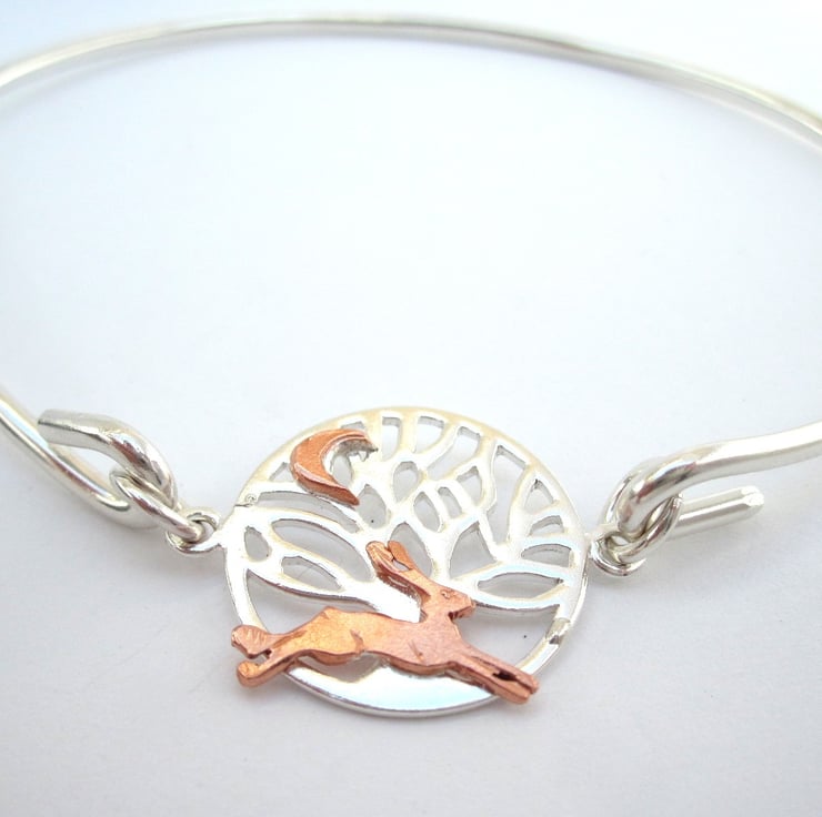 Silver bangle with copper hare detail. A Bangle for people who don't normally wear them! A pretty Copper hare runs under a Moon, before a 925 Silver Tree of Life.