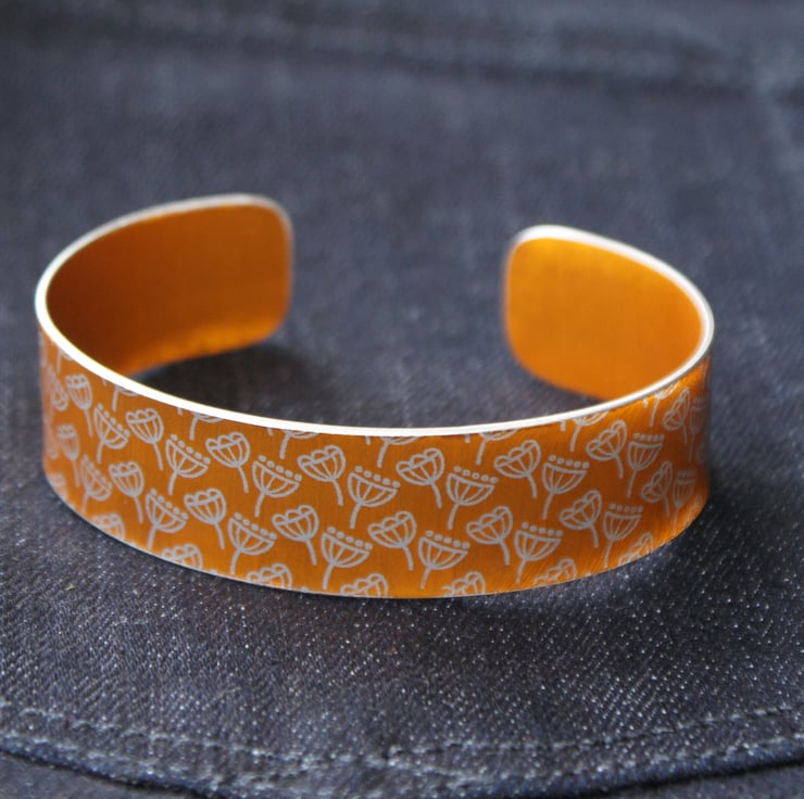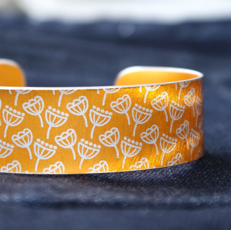 A fun narrow cuff made from anodised aluminium with a mini print of seed heads. I drew this pattern digitally, made it into a resist and applied it to the metal. I then dye the aluminium, seal it and remove the resist which leaves the pattern showing in the original colour of the metal. The cuff is then made using traditional metalworking techniques.