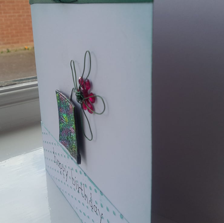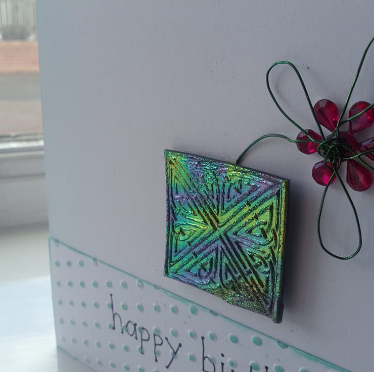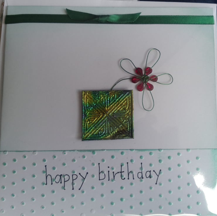 A completely handmade and uniquely designed card consisting of a square of blue/green/gold meldable plastic which has had a celtic design stamped into it. A daisy made from green wire pops out from behind the square with deep pink flower centre. A strip of green shaded dotty embossed ard along the bottom with happy birthday handwritten in black ink. An enerald green ribbon and bow finish off the top of the card Mounte onto quallity white card which has been shaded in greeny blue.