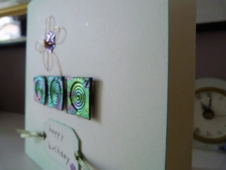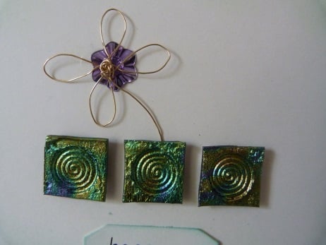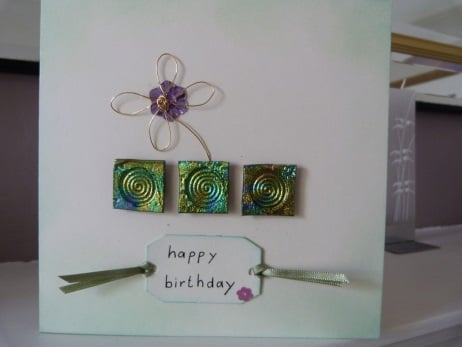 A completely handmade and uniquely designed card consisting of a row of three squares made from blue/green/gold meldable plastic with a spiral design stamped into it. A gold wire daisy pops out from behind the centre square with lilac flower centre.