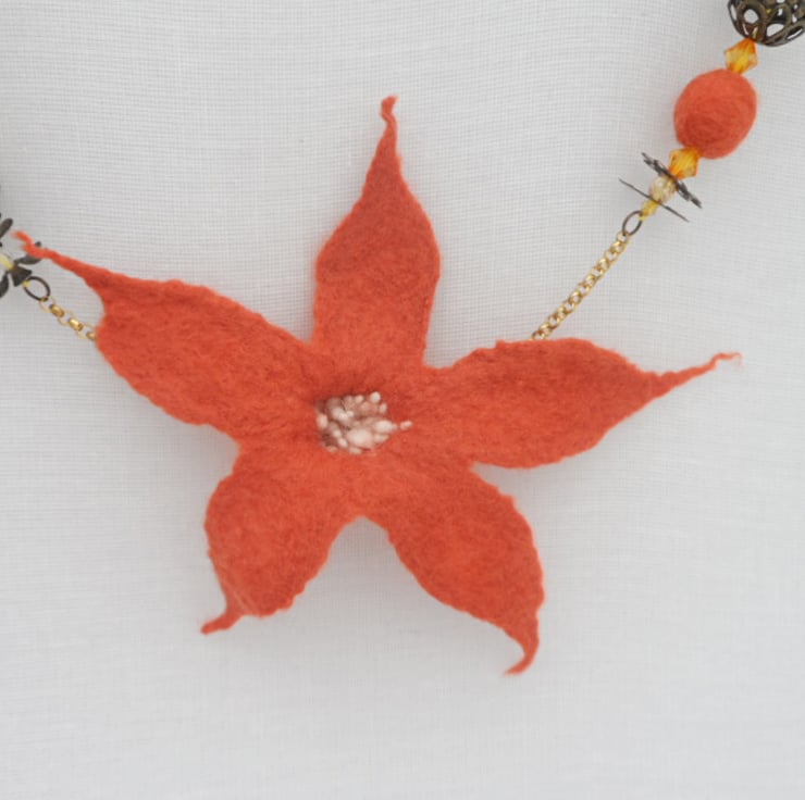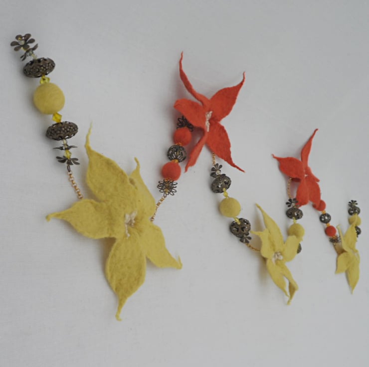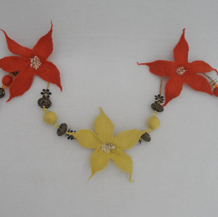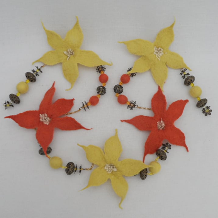 The flowers in this garland are hand felted from yellow and orange merino wool. Each flower measures approximately 15cm (6") in diameter. Five flowers in alternating yellow and orange colours have been strung together, interspersed with beaded sections. The beaded sections are made using a variety of co-ordinating felted balls, large antique bronze effect filigree beads and flower findings and acrylic bicone beads. These sections are connected to the flowers using gold coloured belcher chain.