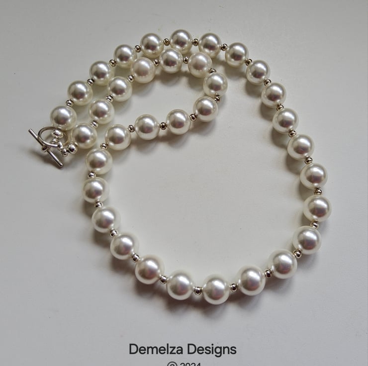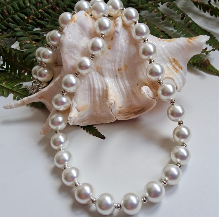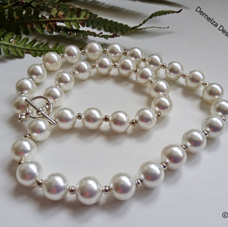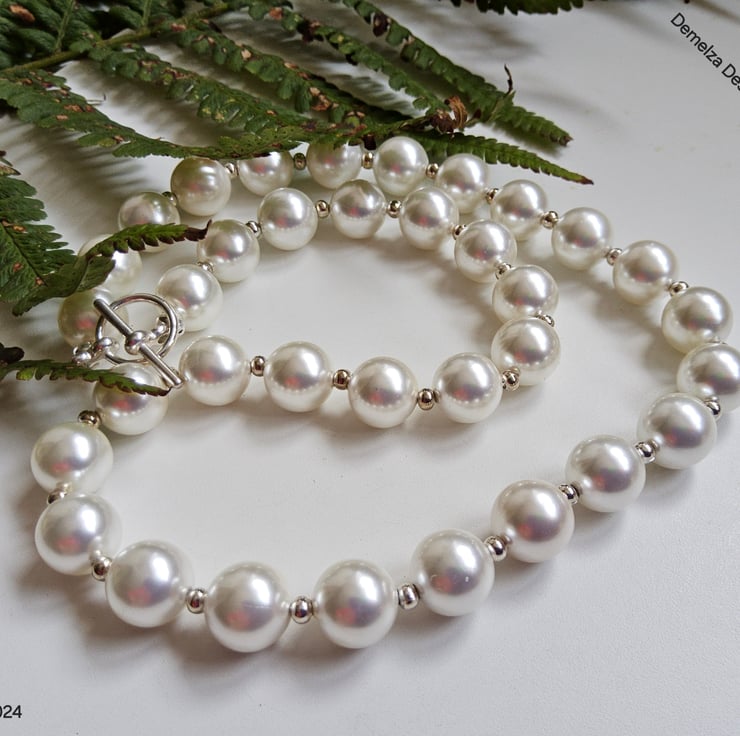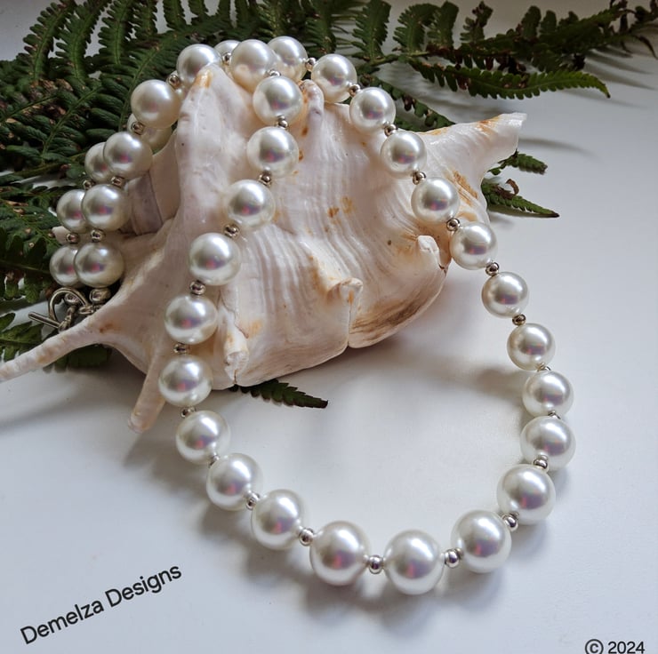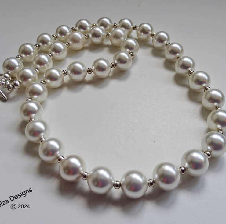 This lovely white shell pearl necklace can be worn every day or for special occasions. Between each 10mm shell pearl is a good quality silver plated 2.5mm spacer bead. The necklace has been constructed using professional stainless steel jewellers wire for added strength and long durability. It has been finished off with a quality silver plated toggle clasp. The finished length is 18"inches.