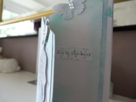 A completely hand made card consisting of quality pristine white card folded three times to form a 'z' shape. Covered in two layers of co-ordinating papers in pale turquoise. A birthday tag deecoupaged on the front and on the inner is You're the Best. Decorated with 5 butterflies some double layered. Their bodies enhanced with silver rhinestones.