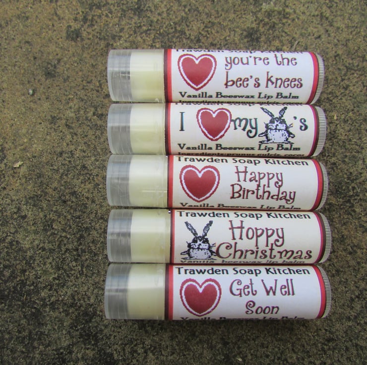 This listing is for one lip balm tube (approx. 5g) in Vanilla (using pure vanilla bourbon extract for a rich smooth taste. These lip balms have a heart & bunny, caring theme. Please message me regarding which themed text you would like out of: