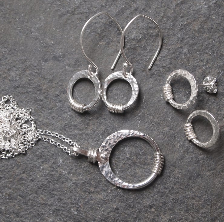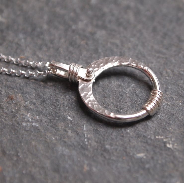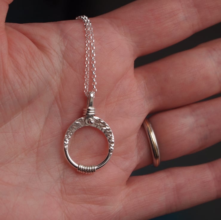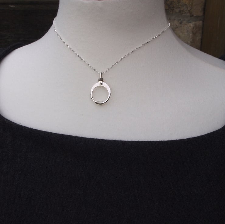 Silver pendant made by hand from a ring of sterling silver that has been forged to shape, hammered to add surface texture and wire wrapped to add further detail to the design.