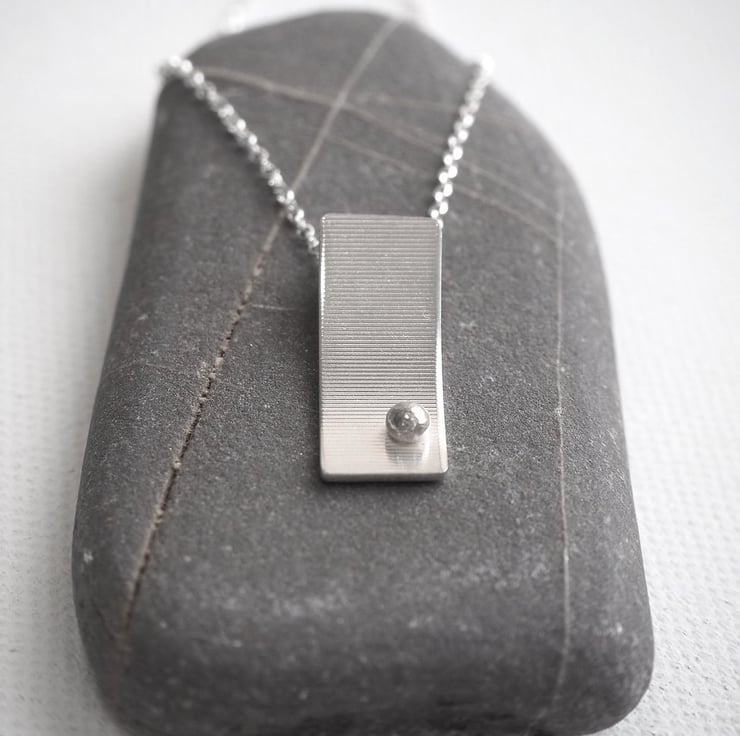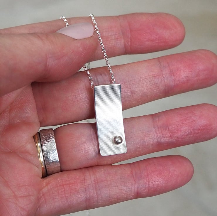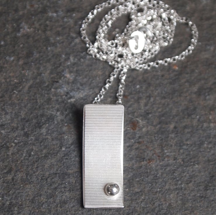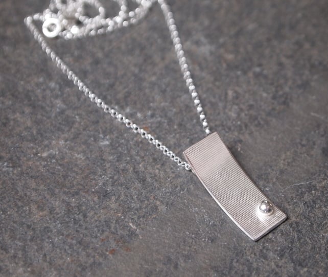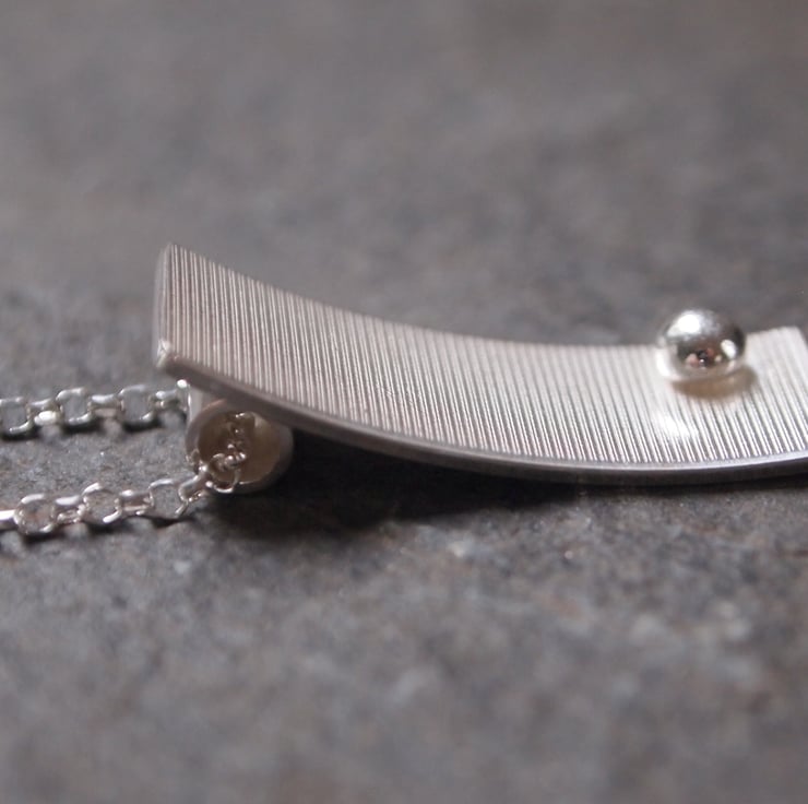 This rectangular arc pendant is handmade from sterling silver. It has a ball of recycled sterling silver in one corner and a stripy surface texture.