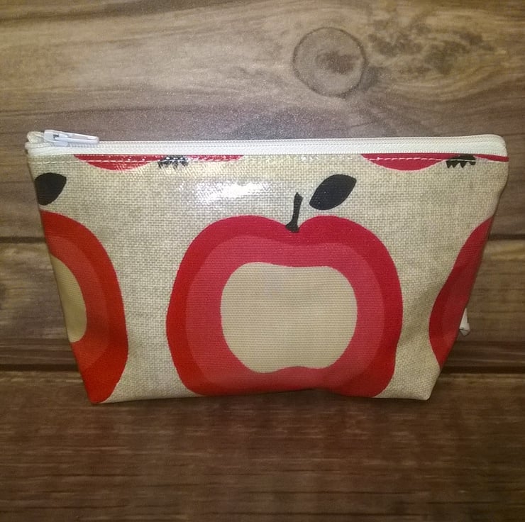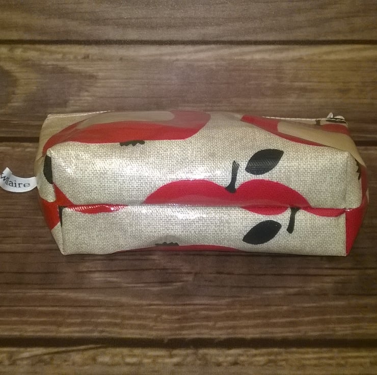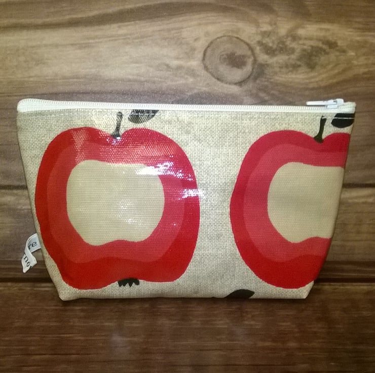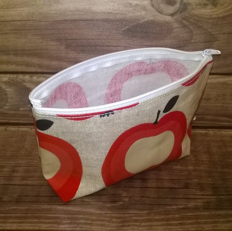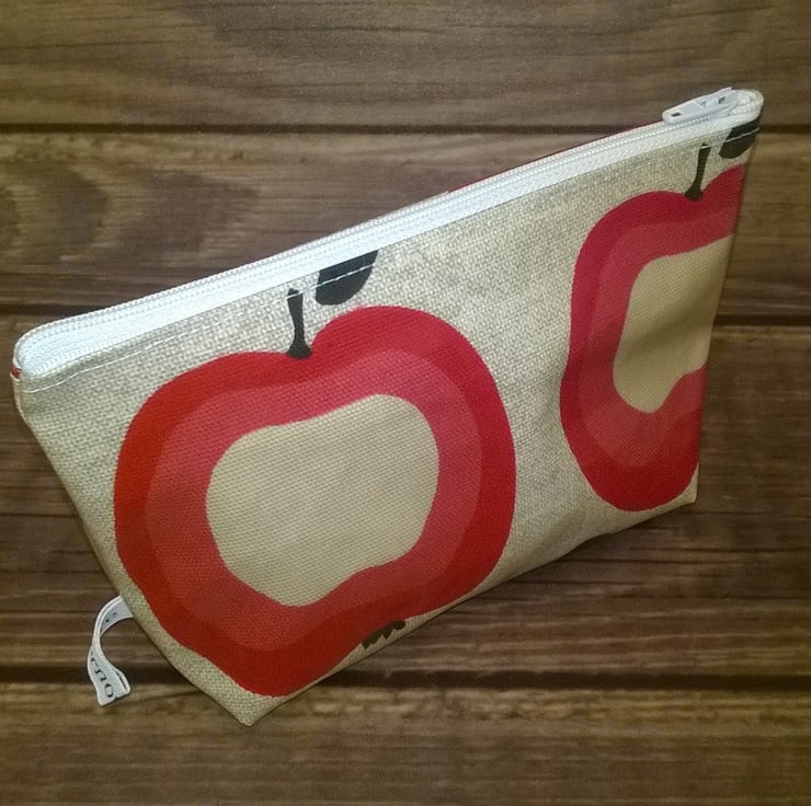 This is a lovely make up bag in beige with red apples design. It has a white zip and stitching and a boxed bottom for more space.