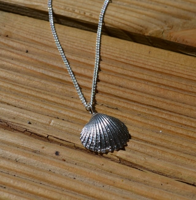 Inspired by the coastline of North Norfolk, this handmade necklace has been cast in solid pewter from a handmade mould made from real cockle shells. The chain is sterling silver.