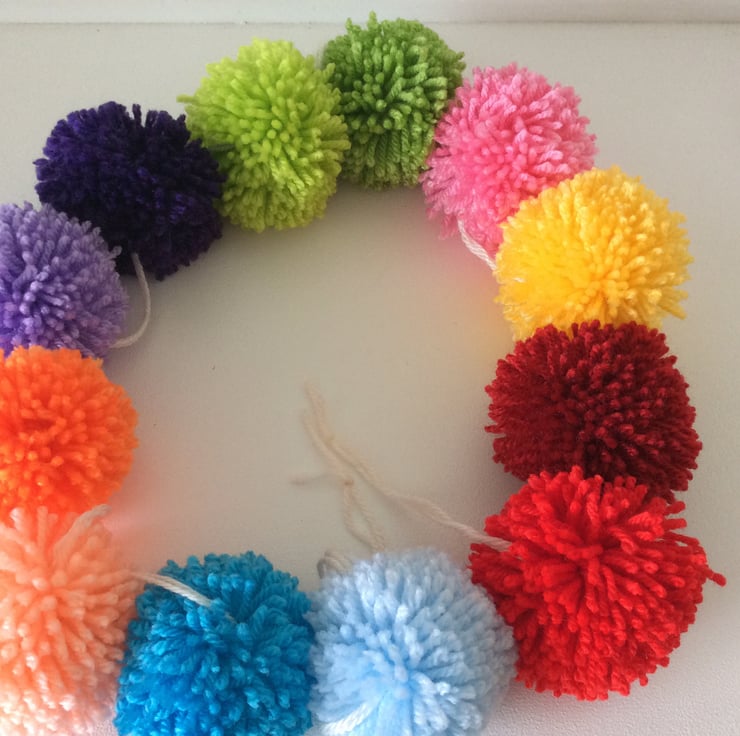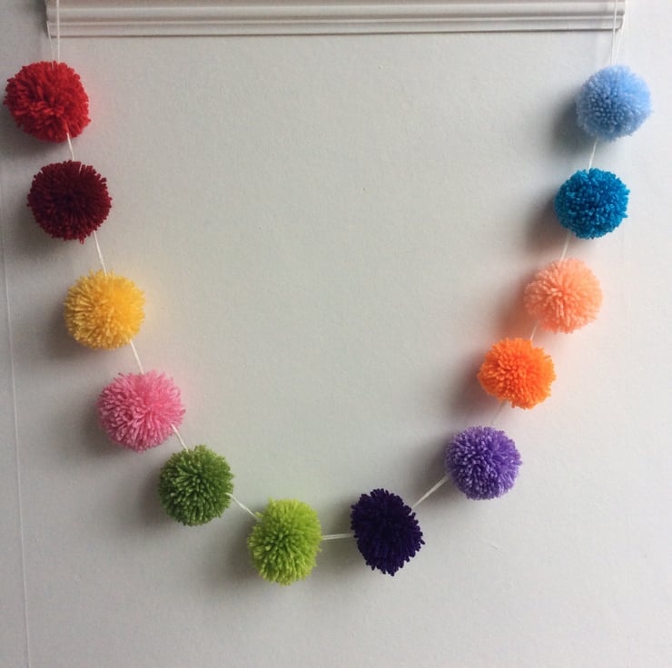 A handmade 12 bobble Pom pom garland in, rainbow colours. Pom poms are 6.5cm in diameter and are attached to 1.5m of yarn. The Pom poms are in a fixed position along the garland and each end is knotted to allow it to be hung at each end.