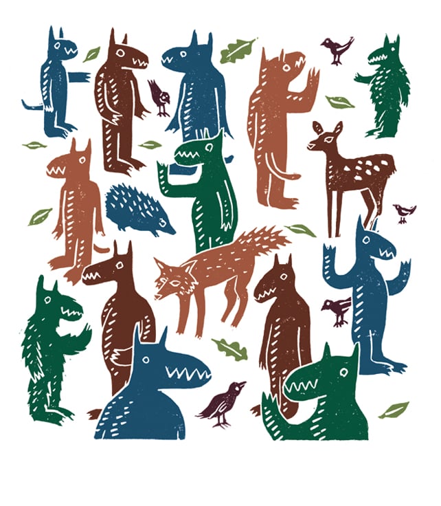 I was partly inspired by the event for which the print was created, a music festival in the beautiful setting on Endcliffe Park, Sheffield, and partly also by the idea of these unspecified 'creatures' just hanging out with some more typical forest wildlife!