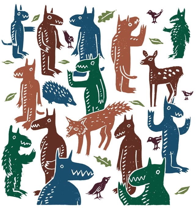 The fifth in my series of forest creature poster-prints, this time featuring several 'creatures' hanging around with some more recognisable wildlife.