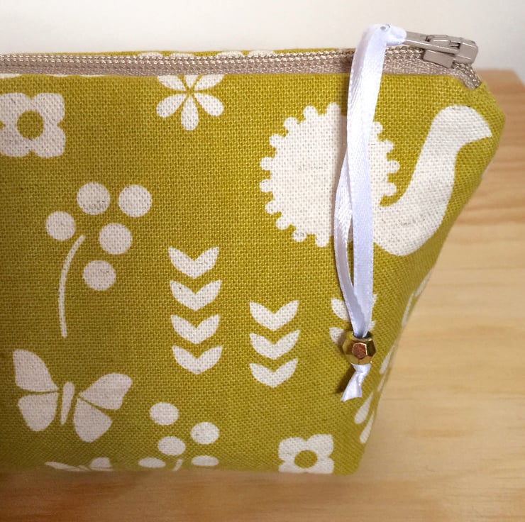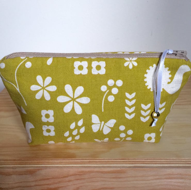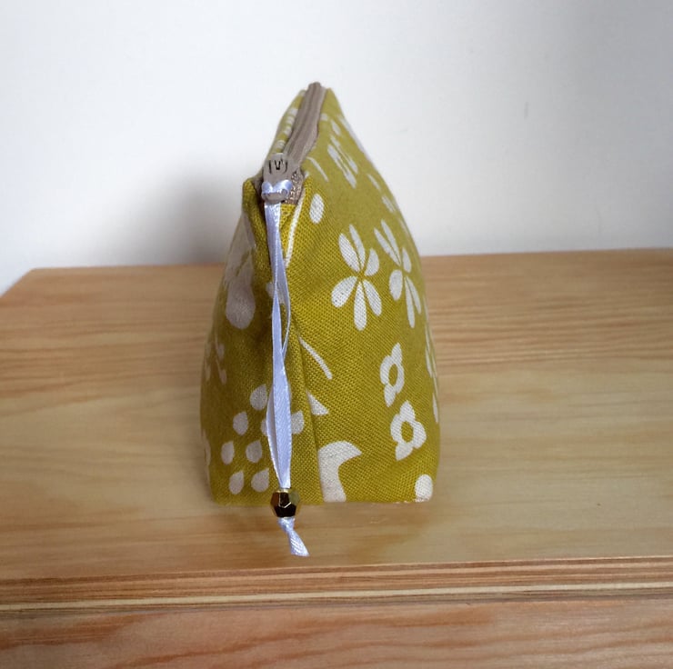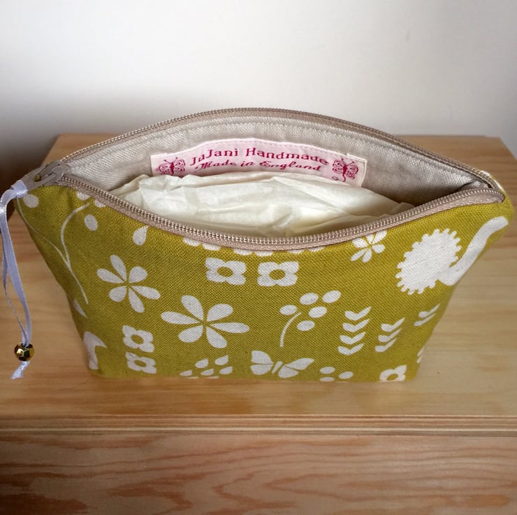This attractive cosmetic bag is made from a mustard green modern flower and butterfly print cotton linen fabric and lined with a contrasting linen.Both the bag and lining have been interfaced to give structure and the corners have been boxed to provide stability.The bag has a matching taupe zip and a white satin ribbon zip closure.A gold coloured bead has been added to the ribbon for decoration.A perfect accessory to keep your make up and toiletries together and tidy in your handbag.