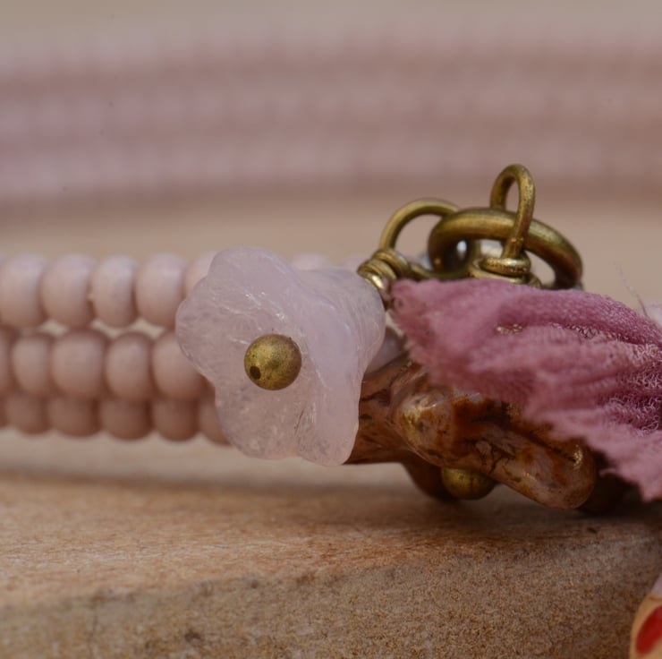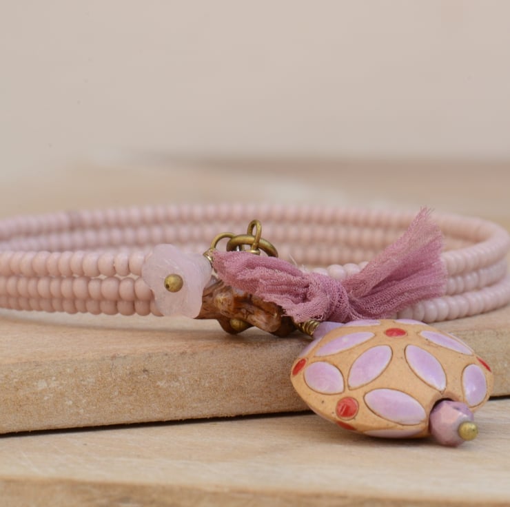 A memory wire wrap bracelet comprising of pale rose pink seed beads finished with a Golem Ceramic decorative bead, a bow of chiffon ribbon and flower beads in colours of pale pink and bronze pink Picasso finish.