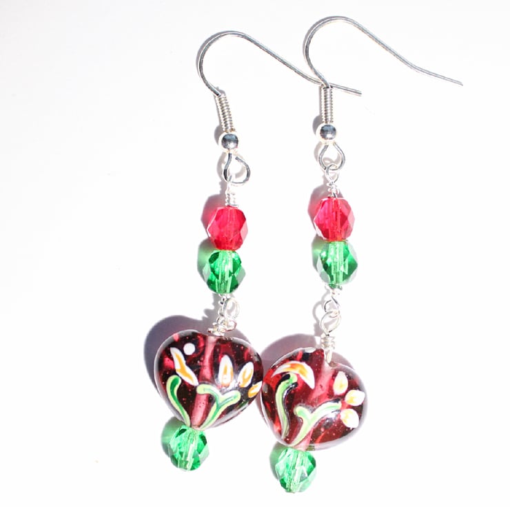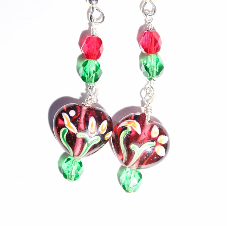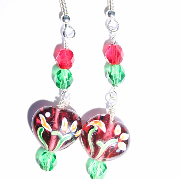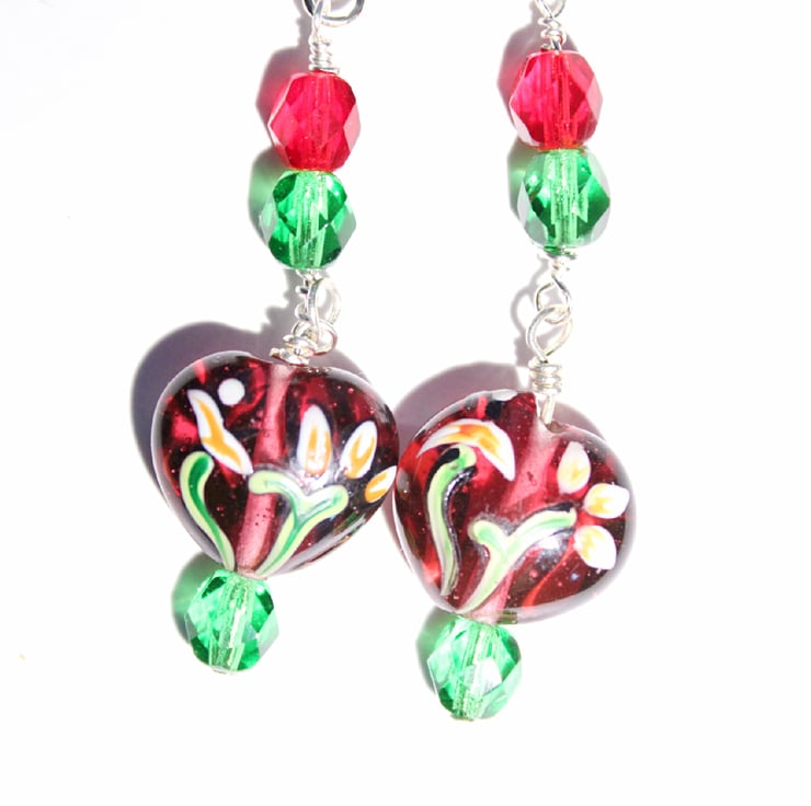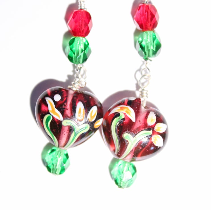 These very feminine and fun dangle earrings are based around a red heart shaped glass bead, painted with a flower design in cream and green. I've used a faceted glass green bead below, to echo the idea of a stem, and then made a wire wrapped component of one red and one green faceted glass bead to go above the heart.