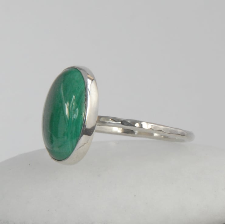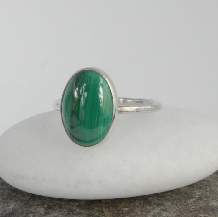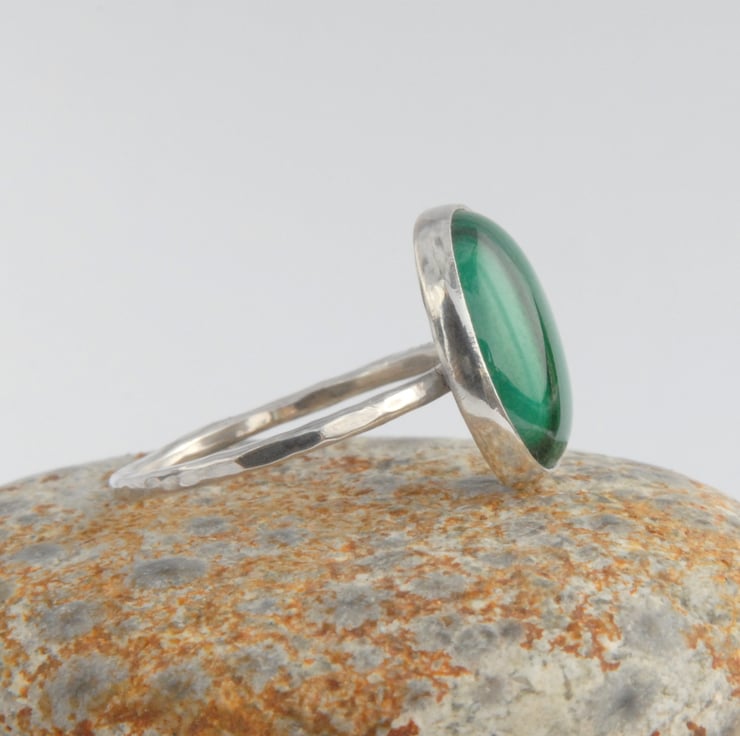 This ring features a bezel set cabochon of highly polished mint green malachite on a hammered sterling silver band. The malachite is 14 mm by 10mm mounted portrait style on the finger to make them look longer and slimmer, the banding on the stone also runs up and down the finger to enhance the illusion. The malachite is mint green with bands of mid and dark green.