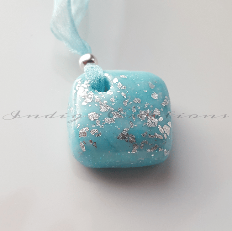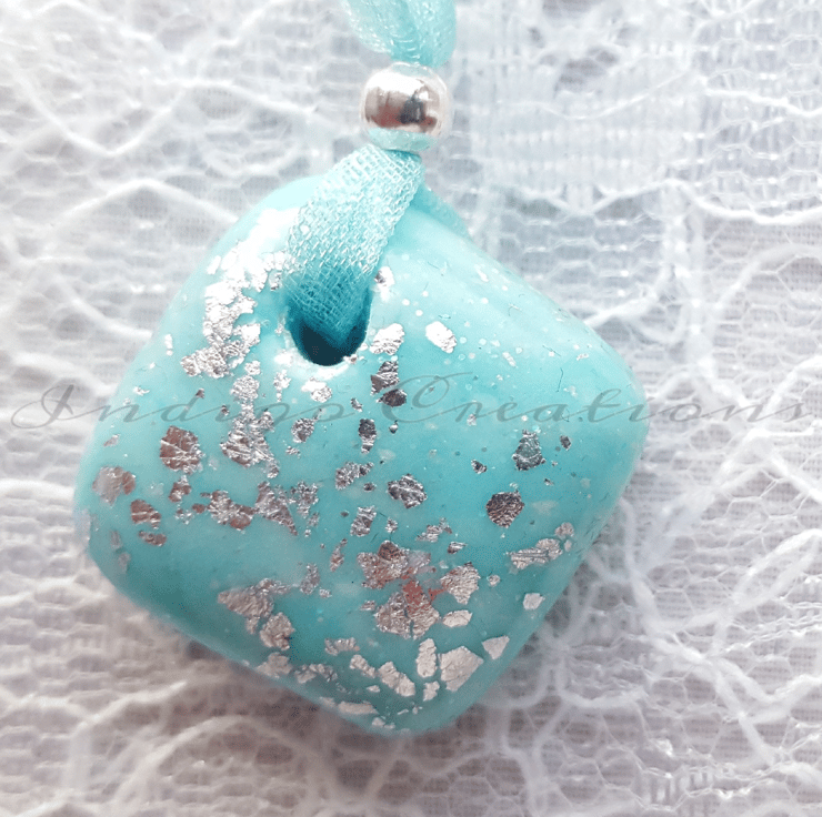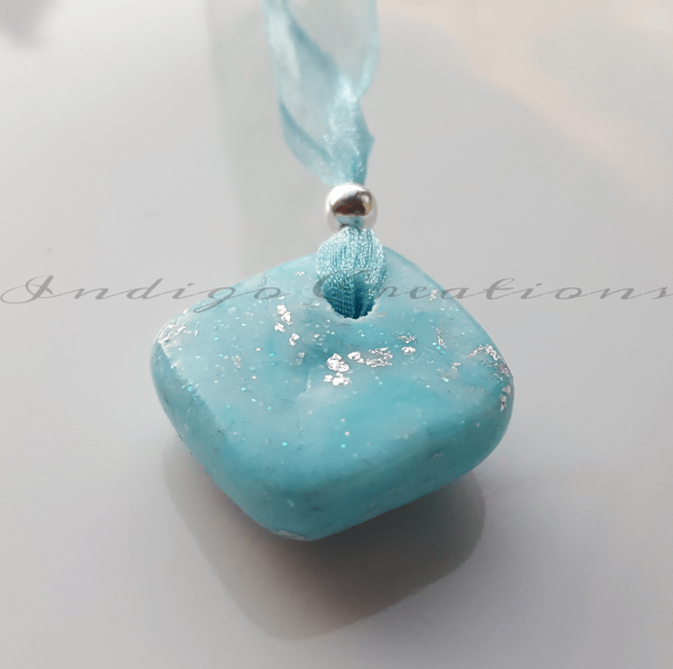 I used Fimo turquoise, white and a small amount of dark blue clay mixed together with silver leaf to create the effect.The pendant has been glazed with Sculpey Gloss. The pendant hangs from pale blue satin edged organza ribbon and is brought together with a silver plated bead, a chain may be added if preferred.