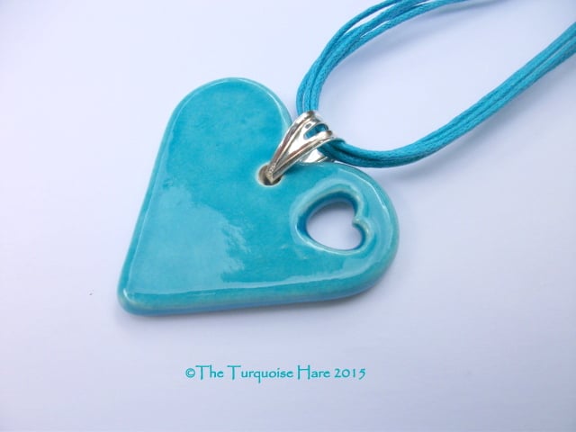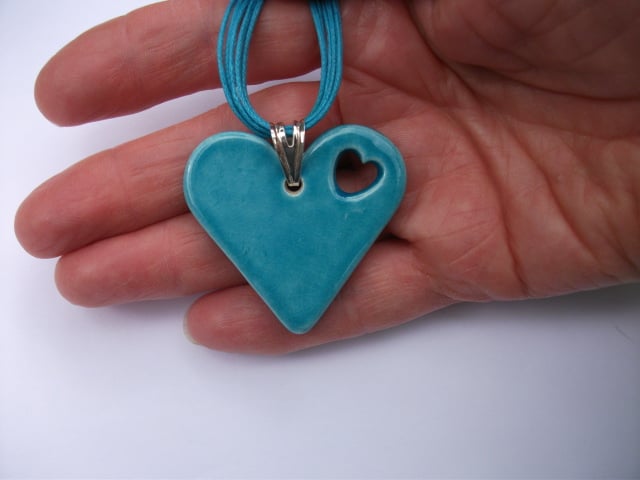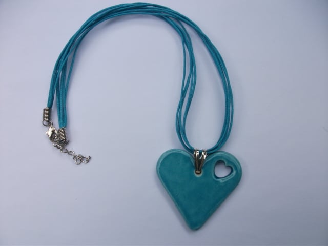 Turquoise ceramic heart pendant with a cut out heart in the corner. Hanging from a sterling silver pronged bail, on a 5 strand corded 16 inch necklet. The clasp is metal.