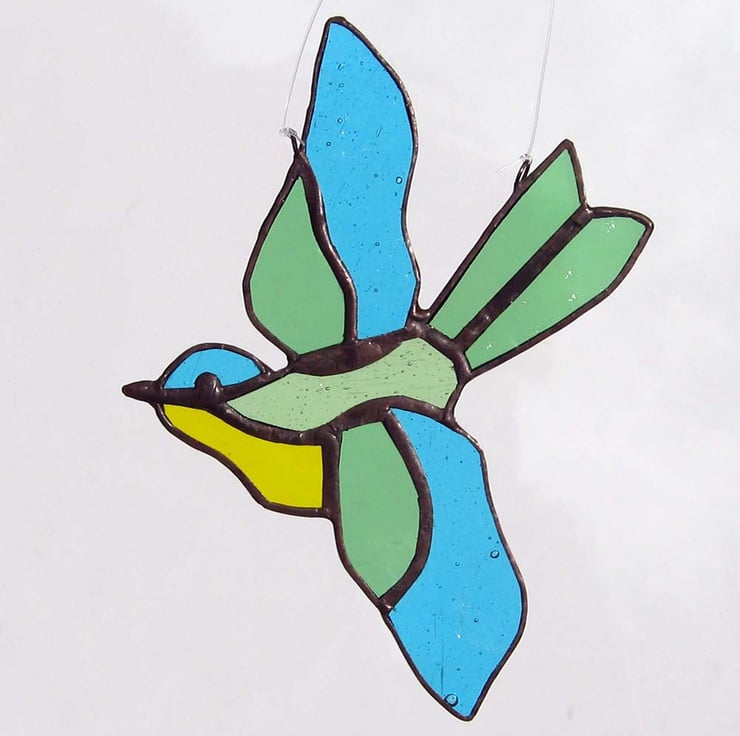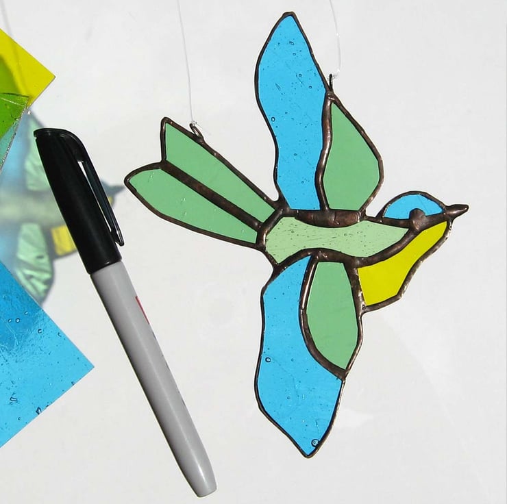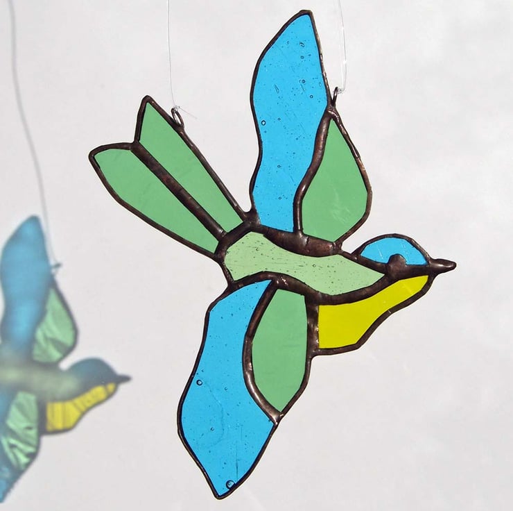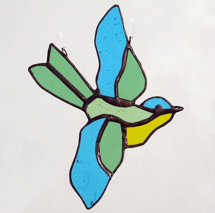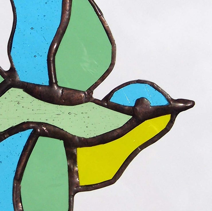 This little bird suncatcher has been made using the copper foil technique. Each piece of glass is cut, edged in copper foil and soldered together.