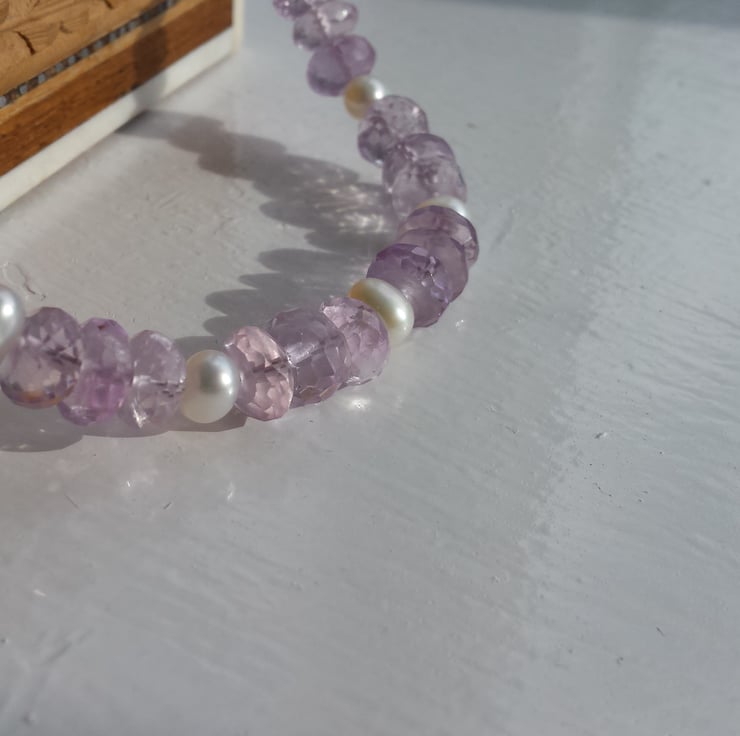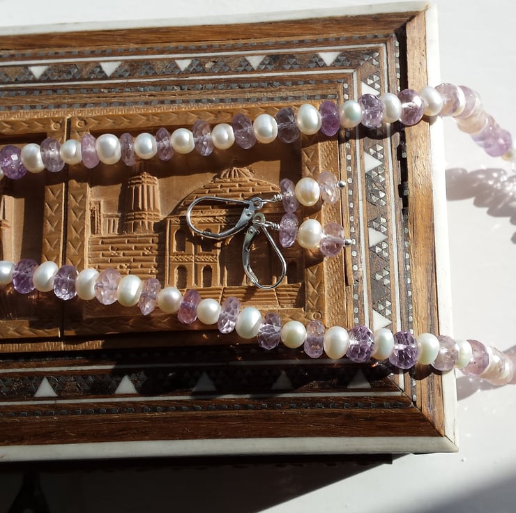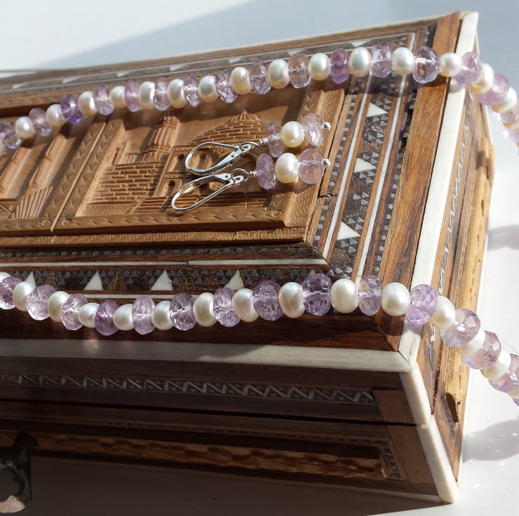 Sparkling delicate rondelles of pink amethyst and cultured white pearls combine to make this beautiful and timeless set, perfect for your special day and many years to come. The necklace is 18in/46cm in length and the earrings fall 2cm from the lever back hook. All fixings are hallmarked sterling silver. The cultured pearls are classed as 'potato' shaped as they are not round, more oval but I find they fit beautifully between the amethysts.